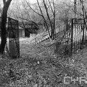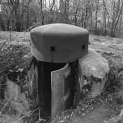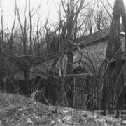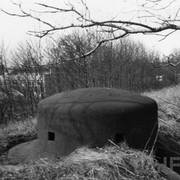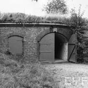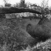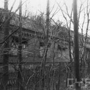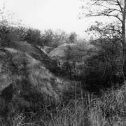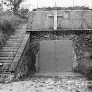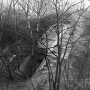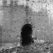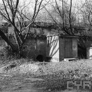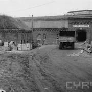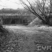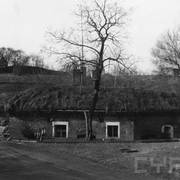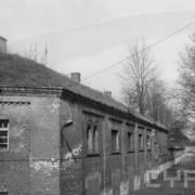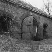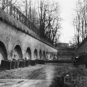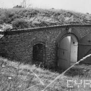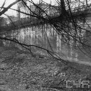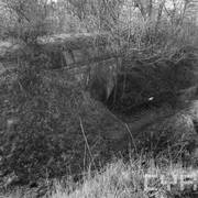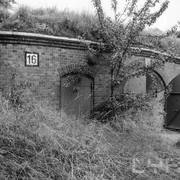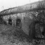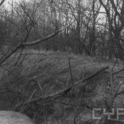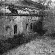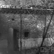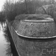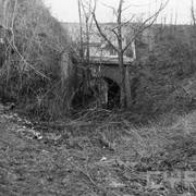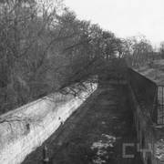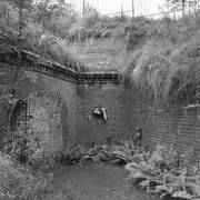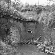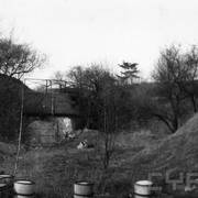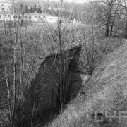Fort IXa Witzleben na Dębcu, szyjowa część fosy, na wprost kaponiera szyjowa i pomieszczenia koszar, w dolnej części krata forteczna otaczająca fort1983