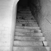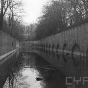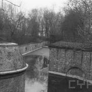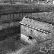 Zachowany przyczółek zachodni jazu Katedralnego na Cybinie (Dom Schleuse) z fragmentem muru ze strzelnicami i zachodnim przyczółkiem dawnego mostu Cybińskiego06.1982