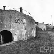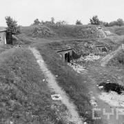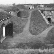 Strefa szyjowa fortu VIa, w miejscu zapadliska wjazd wraz z główną poterną, z prawej kaponiera szyjowa, po obu stronach widoczne także koszary i krata forteczna1946