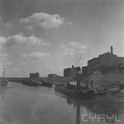 Przystań na Warcie na wysokości ul. Czartoria, z lewej gazownia i kościół ewangelicki pw. Świętego Krzyża (obecnie katolicki pw. Wszystkich Świętych), z prawej mur przeciwpowodziowy wzdłuż ulicy1930
