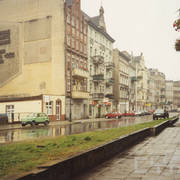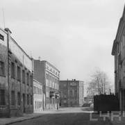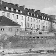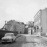 Ulica Czartoria, z prawej puste miejsce, w którym stał osiemnastowieczny spichlerz, dalej kamienica przebudowana z dawnej fabryki cygar na budynek mieszkalny, z lewej mur przeciwpowodziowy1969
