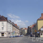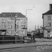 Fragment wschodniej pierzei Rynku Śródeckiego (z prawej niewielki fragment kamienicy wyburzonej w czasie budowy nowej trasy komunikacyjnej na Śródce), w oddali ul. Bydgoska w kierunku północnym1969