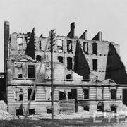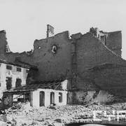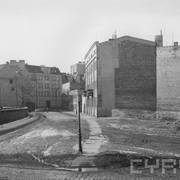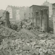 Południowa pierzeja Rynku Śródeckiego rozebrana w czasie budowy nowej trasy komunikacyjnej, w pierwszym budynku od lewej znajdowała się Komenda Dzielnicowa Milicji Obywatelskiej, na bocznej ścianie widoczny fragment reklamy gry liczbowej1969