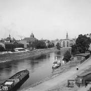 Barki zacumowane na prawym brzegu Warty, w oddali od lewej dom główny Towarzystwa Chrystusowego i Akademia Lubrańskiego, prawdopodobnie okres okupacji niemieckiej
