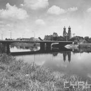 Drewniany most Cybiński zbudowany po wojnie na miejscu prowizorycznej przeprawy z czasów okupacji, w głębi most kolejowy, z lewej fragment dziewiętnastowiecznych obwarowań Ostrowa Tumskiego1960–1969