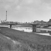 Most Bolesława Chrobrego nad nowym korytem Warty widoczny od strony Chwaliszewa, z lewej Zakład Energetyczny i komin elektrowni, z prawej kościół NMP i psałteria, około 1977 roku