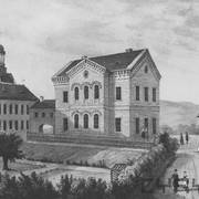 Pierwszy budynek Królewskiego Zakładu dla Głuchoniemych w Poznaniu, fragment kościoła i klasztoru Reformatów (z lewej) na litografii z 1. poł. XIX wieku, obecnie Ośrodek Szkolno-Wychowawczy dla Dzieci Niesłyszących im. Józefa Sikorskiego