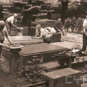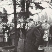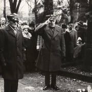 Weterani powstania wielkopolskiego porządkują mogiłę poległych powstańców i żołnierzy wojsk wielkopolskich na cmentarzu Górczyńskim, w środku oparty o grób Maksymilian Szymkowiak, lato 1967 roku1967