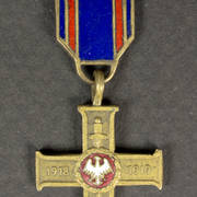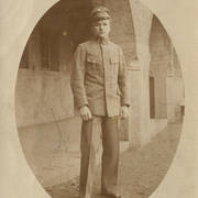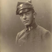 Maksymilian Szymkowiak w mundurze wojsk wielkopolskich i niemieckiej czapce z polskim orzełkiem w czasie pobytu w szpitalu przy ul. Różanej po przebytej operacji1919