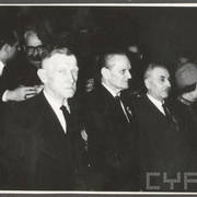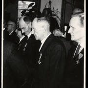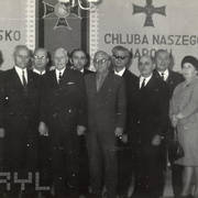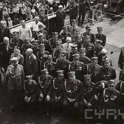 Weterani powstania wielkopolskiego w czasie uroczystości wodowania statku "Powstaniec Wielkopolski" w Ośrodku Kadłubowym Wulkan, w środku Maria Olszewska, uczestniczka powstania wielkopolskiego, matka chrzestna statku26.06.1974