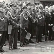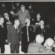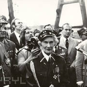 Weterani powstania wielkopolskiego w czasie wodowania statku "Powstaniec Wielkopolski" w Ośrodku Kadłubowym Wulkan, w drugim rzędzie czwarty z prawej w ciemnych okularach Maksymilian Szymkowiak26.06.1974