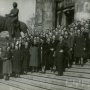 Antoni Czarkowski (trzeci od lewej w czwartym rzędzie od dołu) ze swoją klasą w Technikum Budowlanym przy ul. Rybaki na schodach przed głównym wejściem do szkoły