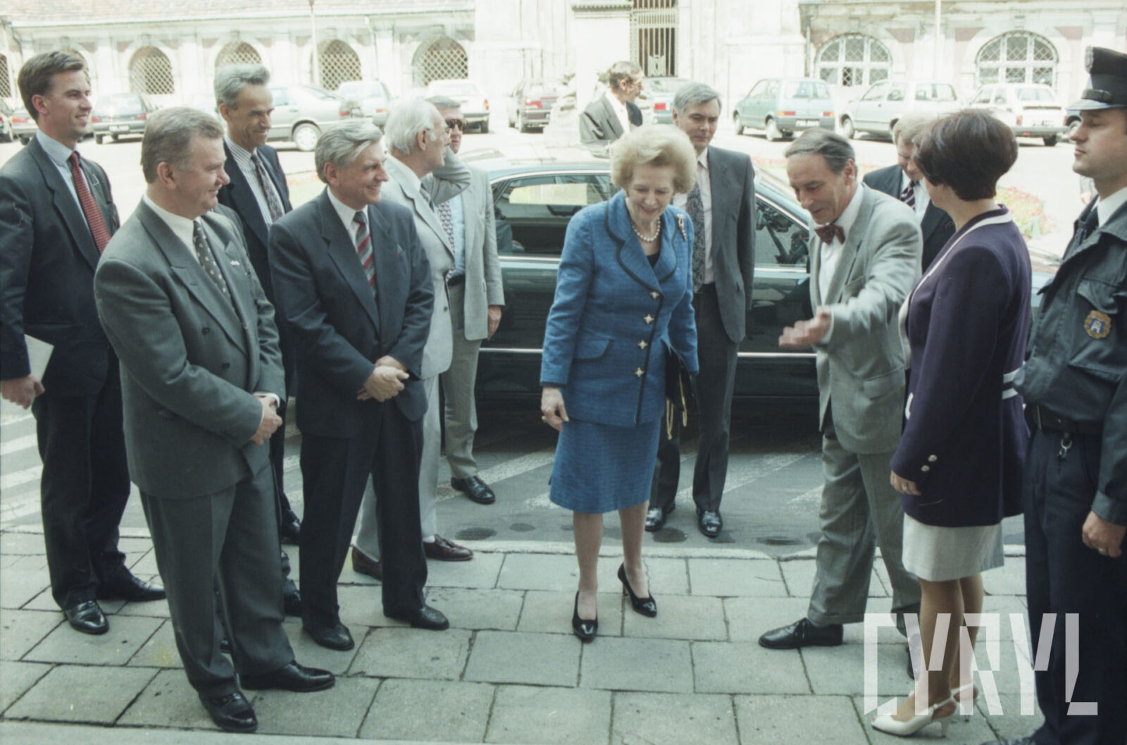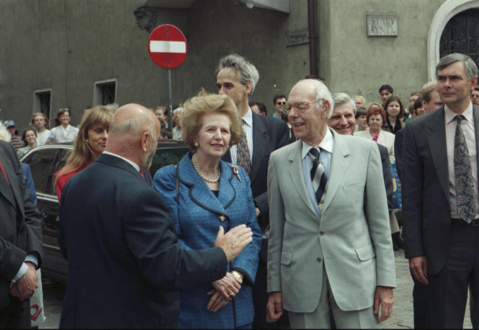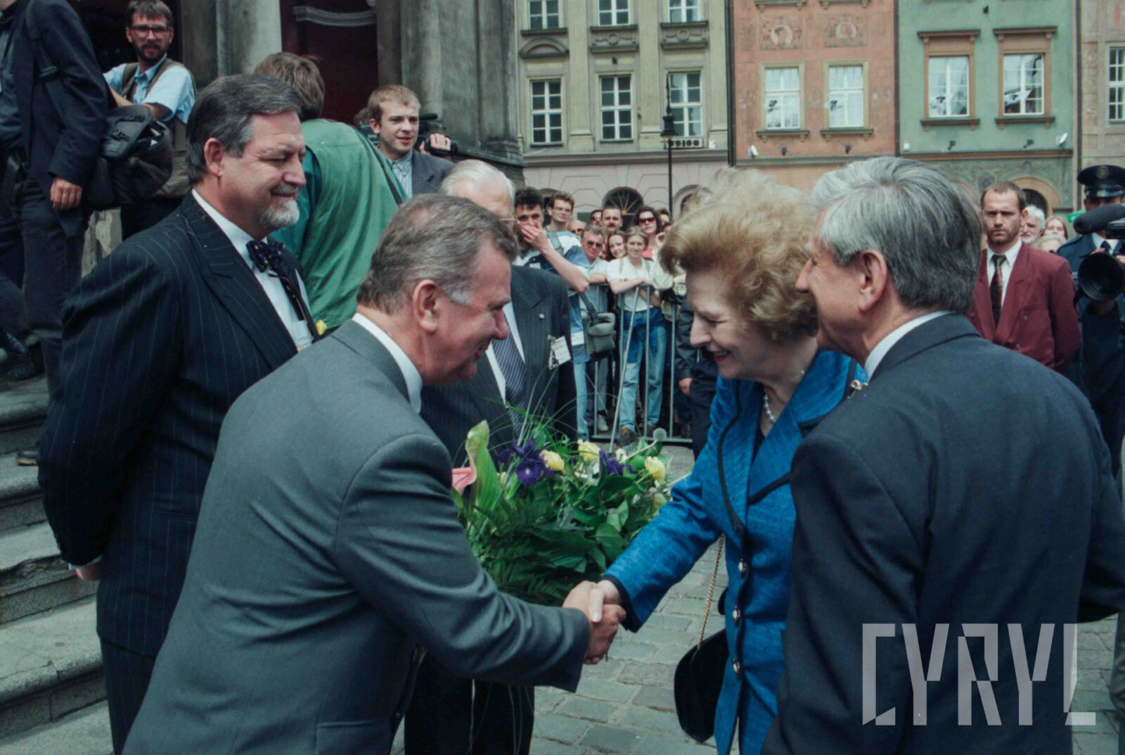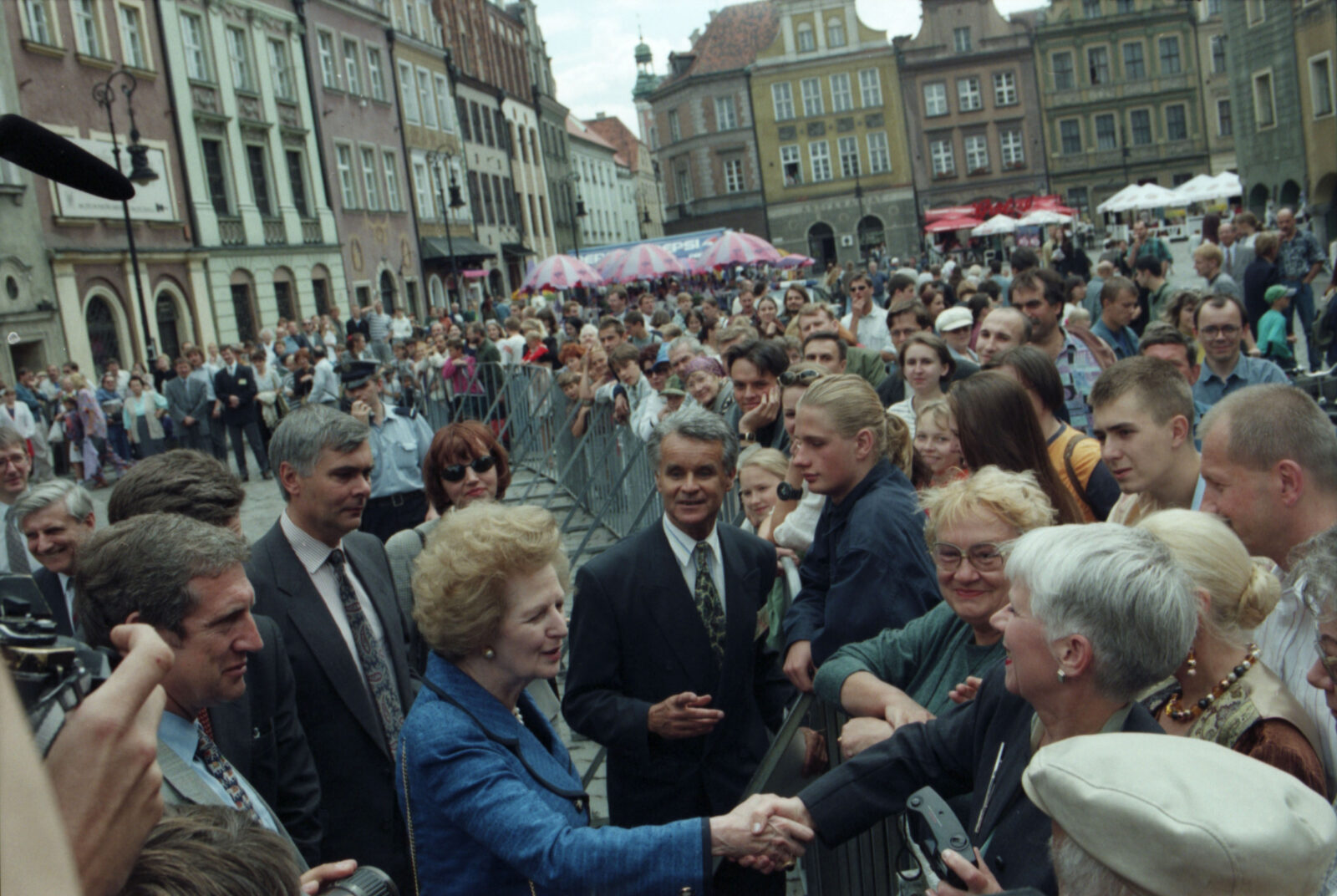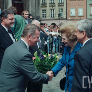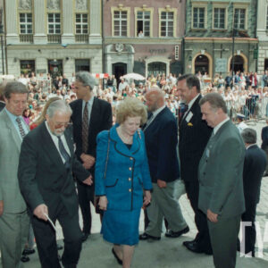 Przywitanie Margaret Thatcher, byłej premier Wielkiej Brytanii, na parkingu przed Urzędem Miasta Poznania (dzisiaj Wolny Dziedziniec) przez prezydenta Wojciecha Szczęsnego Kaczmarka (trzeci od prawej)03.07.1996
