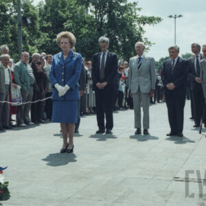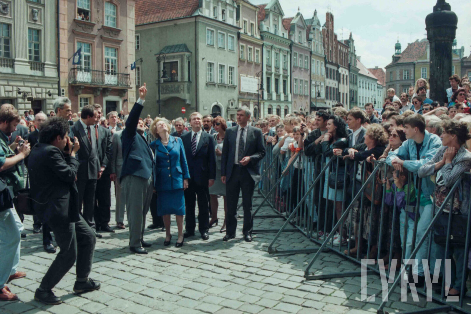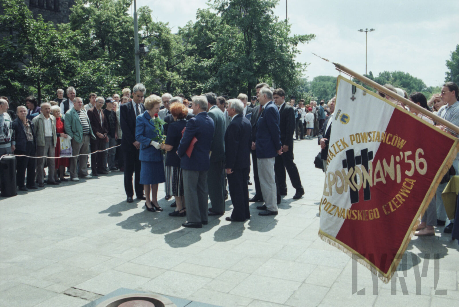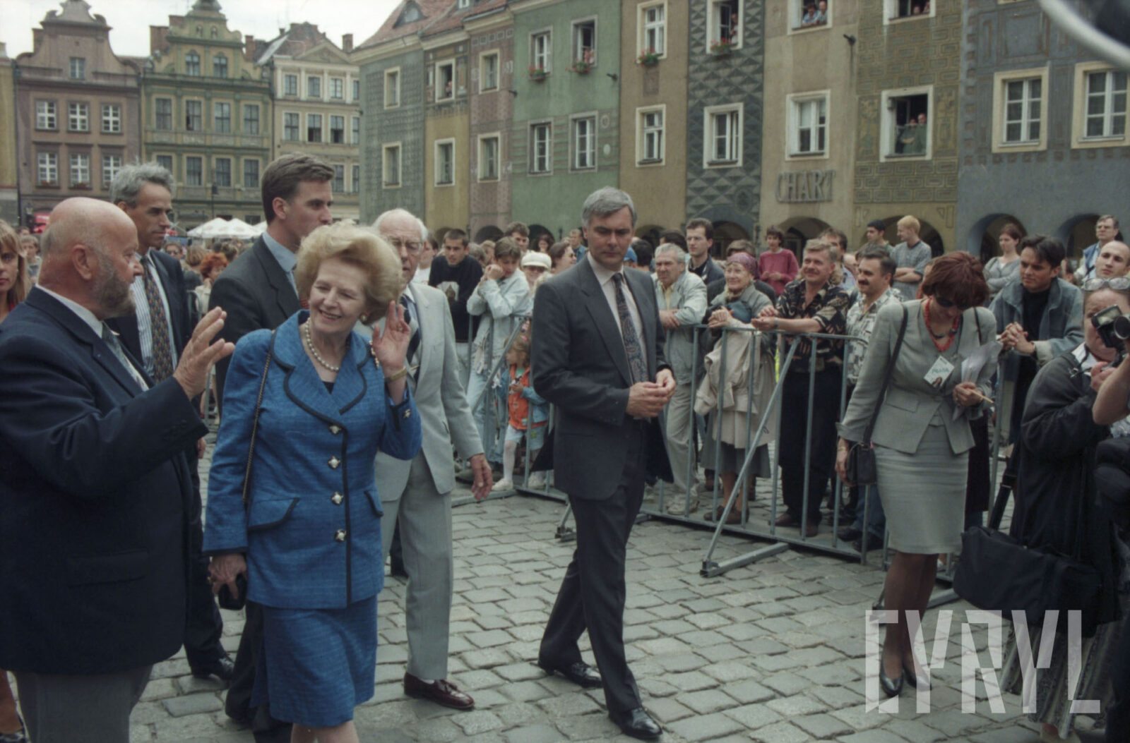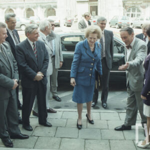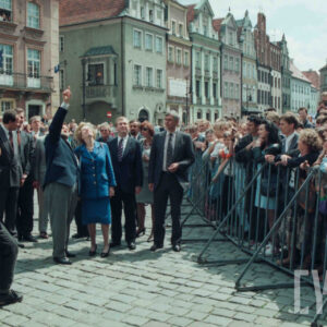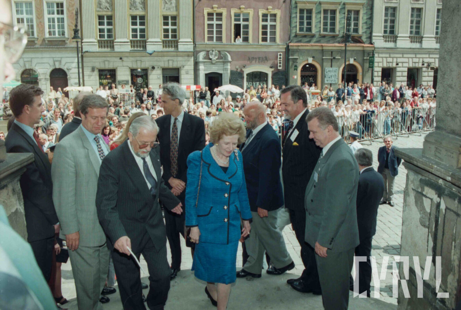 Przywitanie Margaret Thatcher, byłej premier Wielkiej Brytanii, na parkingu przed Urzędem Miasta Poznania (dzisiaj Wolny Dziedziniec) przez prezydenta Wojciecha Szczęsnego Kaczmarka (trzeci od prawej)03.07.1996