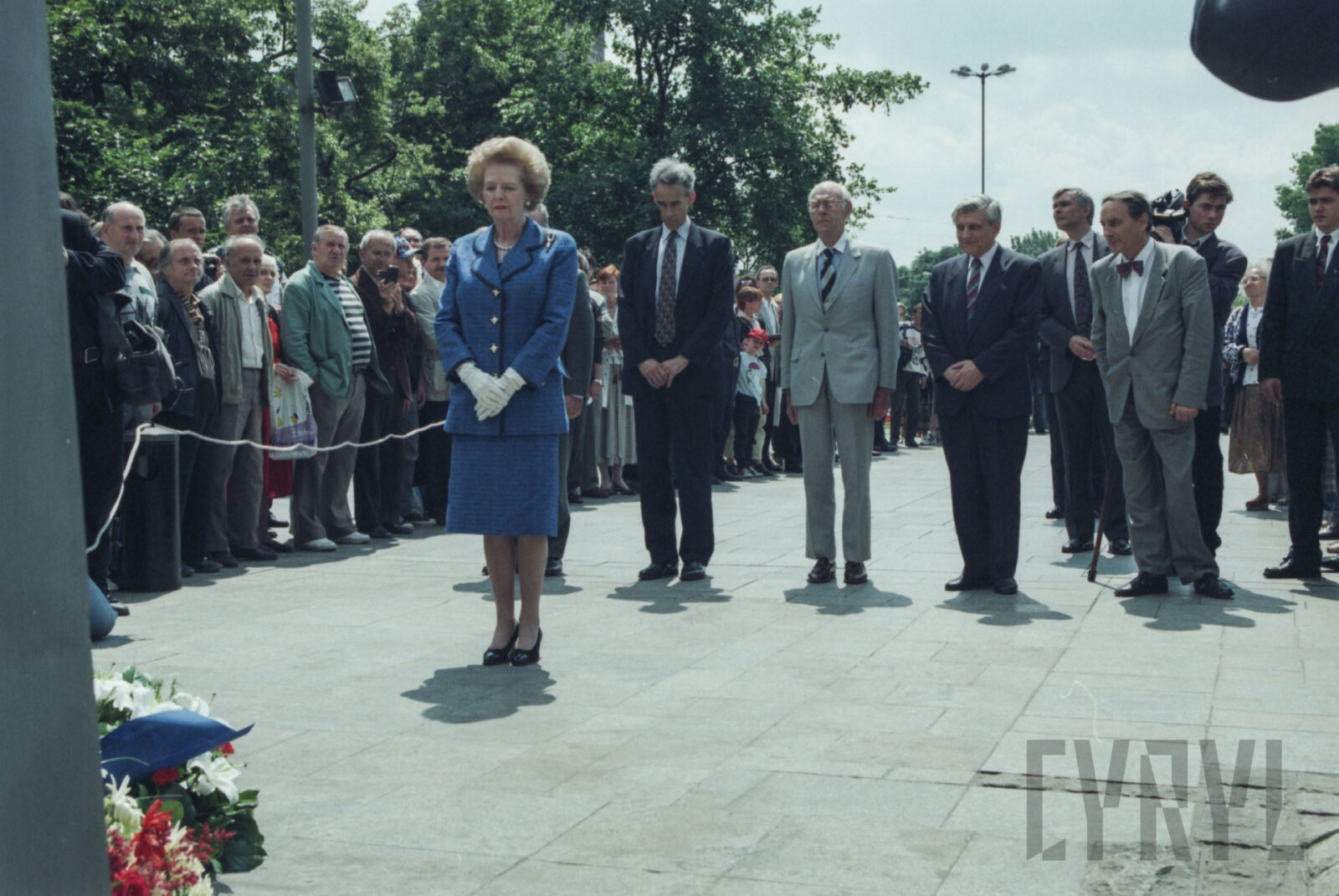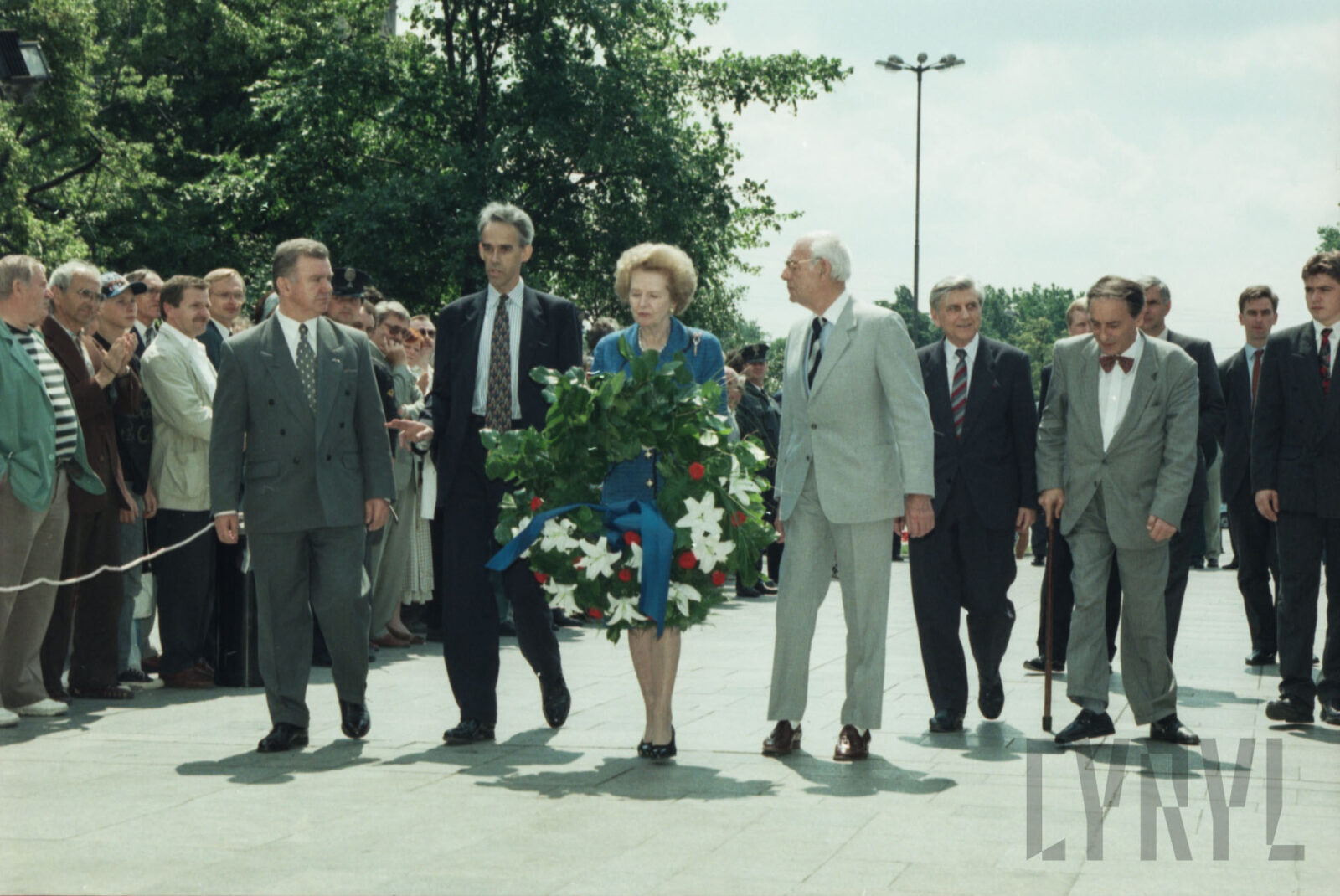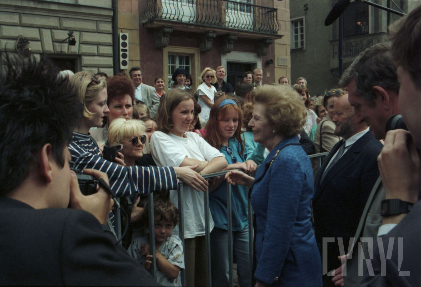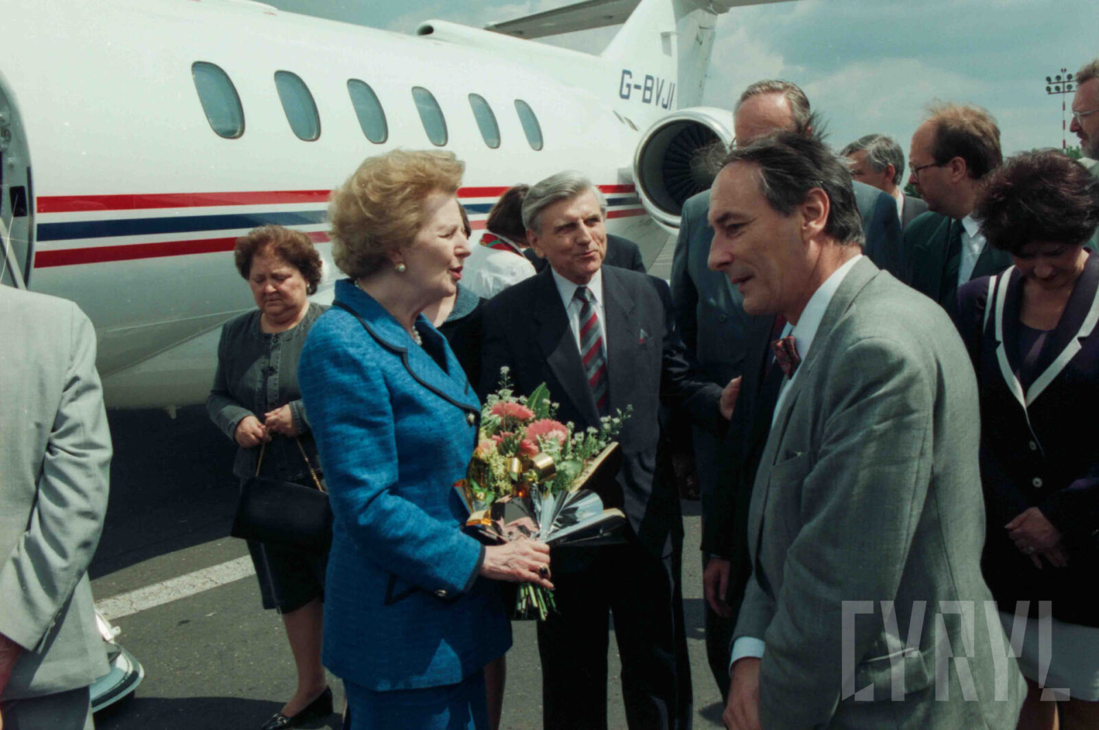 Przywitanie Margaret Thatcher, byłej premier Wielkiej Brytanii, na parkingu przed Urzędem Miasta Poznania (dzisiaj Wolny Dziedziniec) przez prezydenta Wojciecha Szczęsnego Kaczmarka (trzeci od prawej)03.07.1996