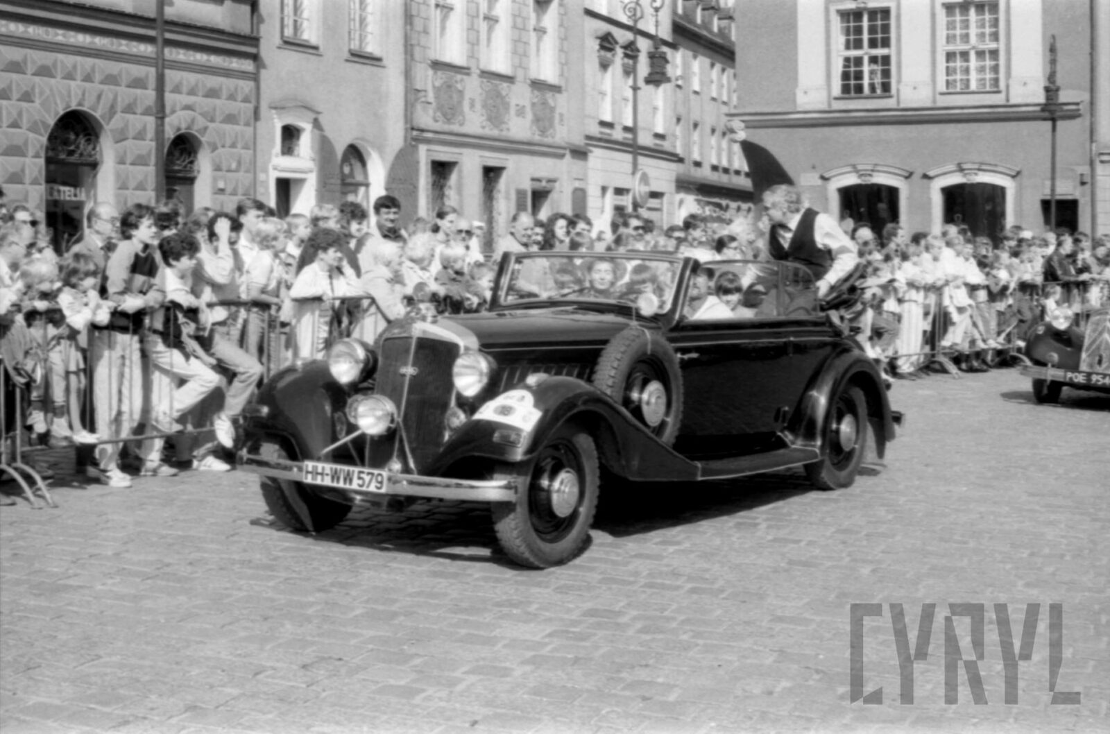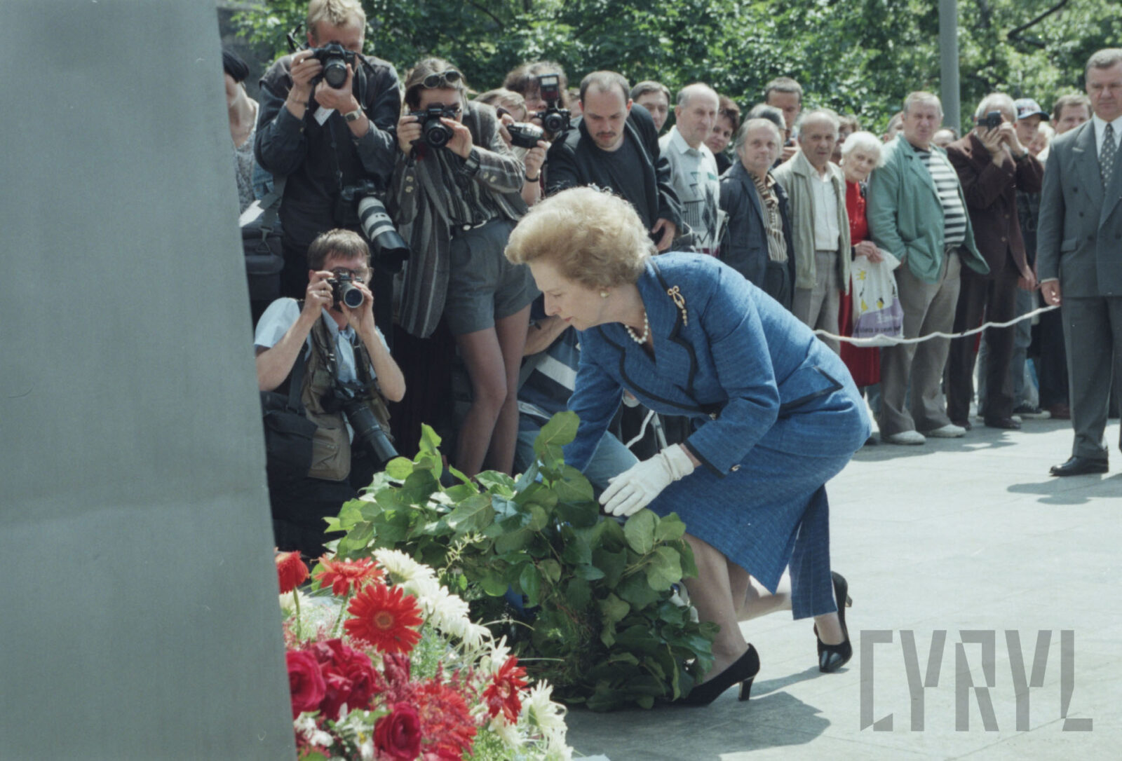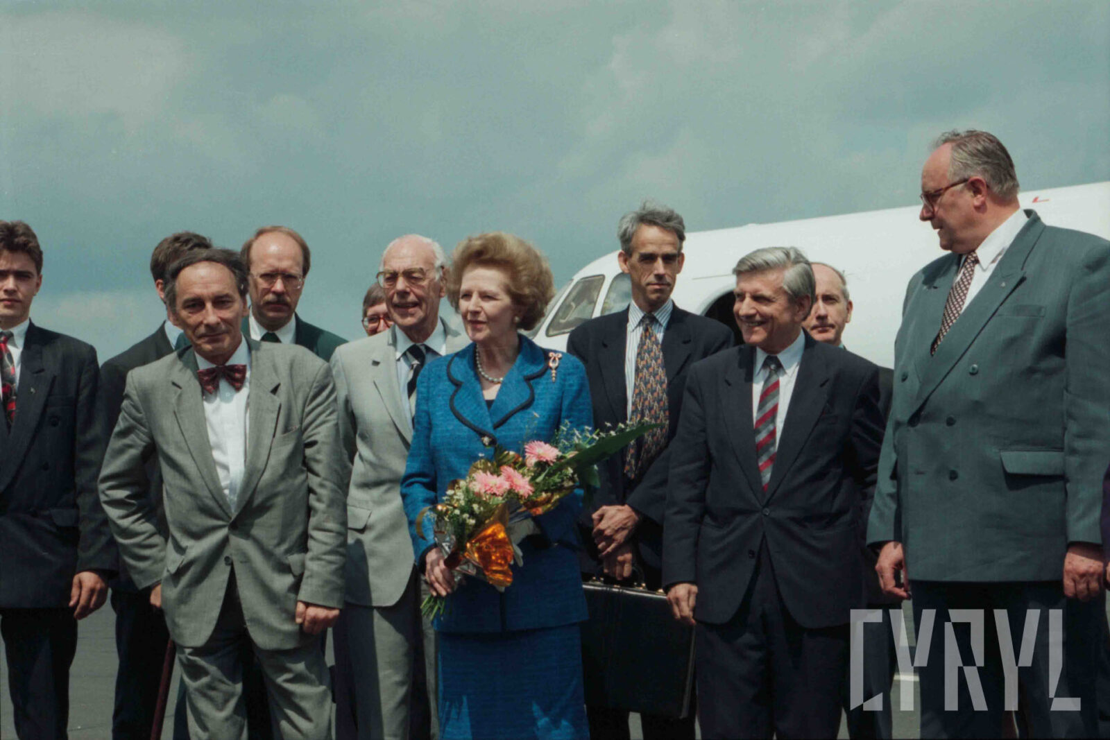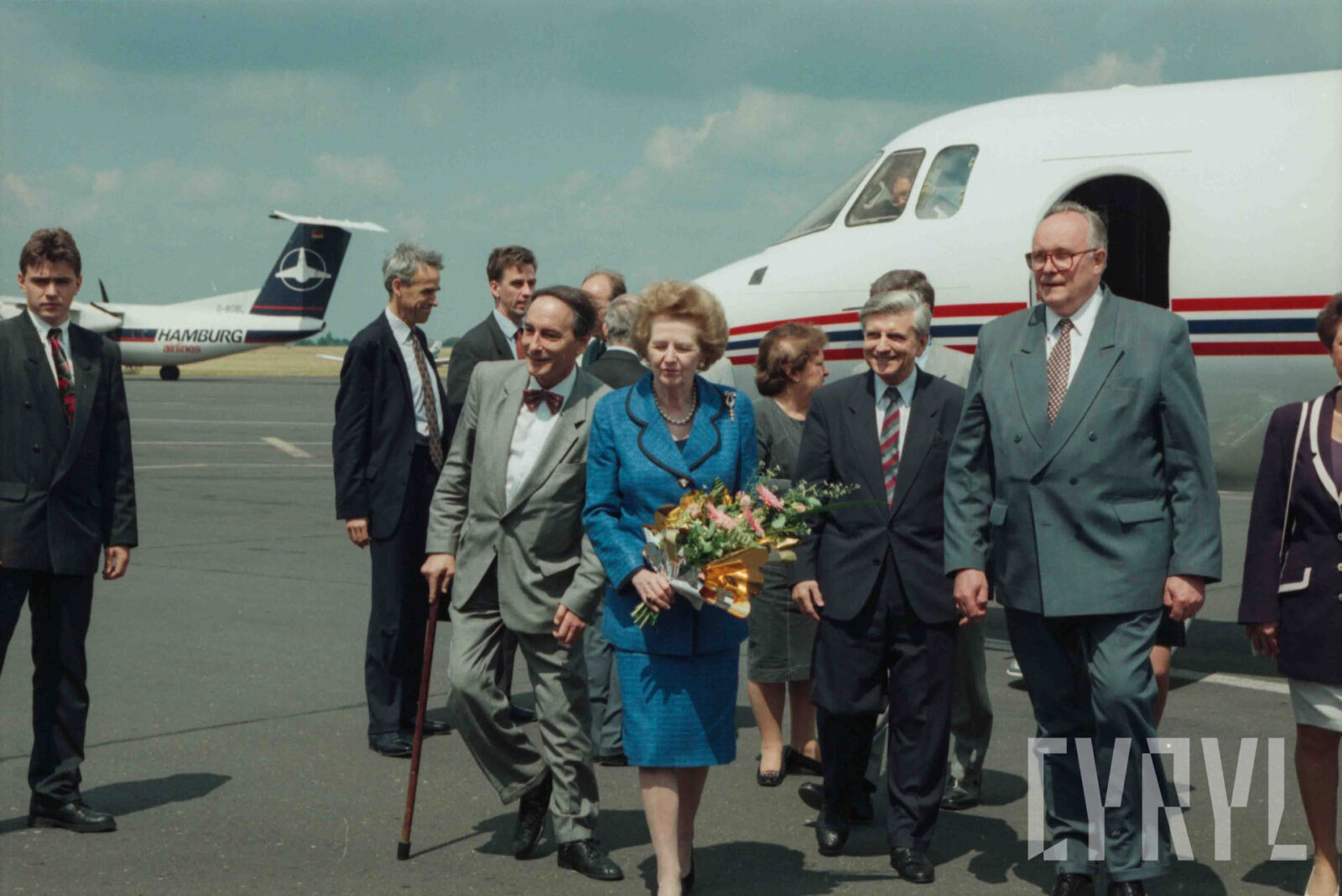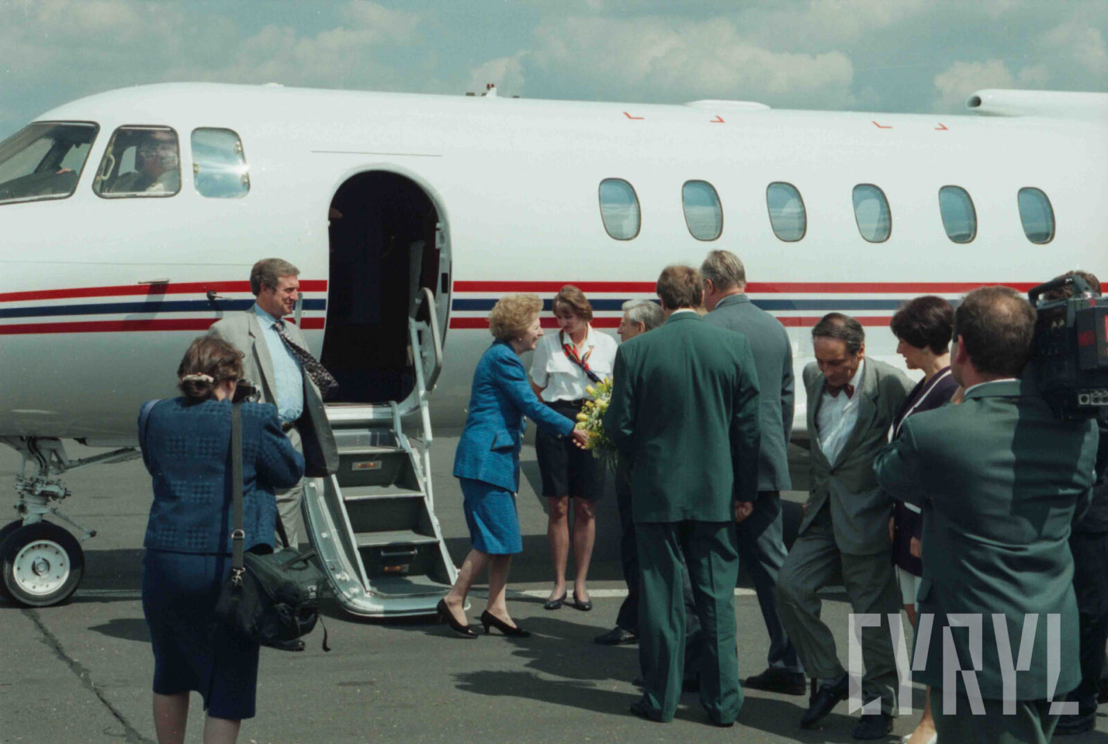 Przywitanie Margaret Thatcher, byłej premier Wielkiej Brytanii, na parkingu przed Urzędem Miasta Poznania (dzisiaj Wolny Dziedziniec) przez prezydenta Wojciecha Szczęsnego Kaczmarka (trzeci od prawej)03.07.1996