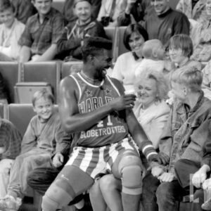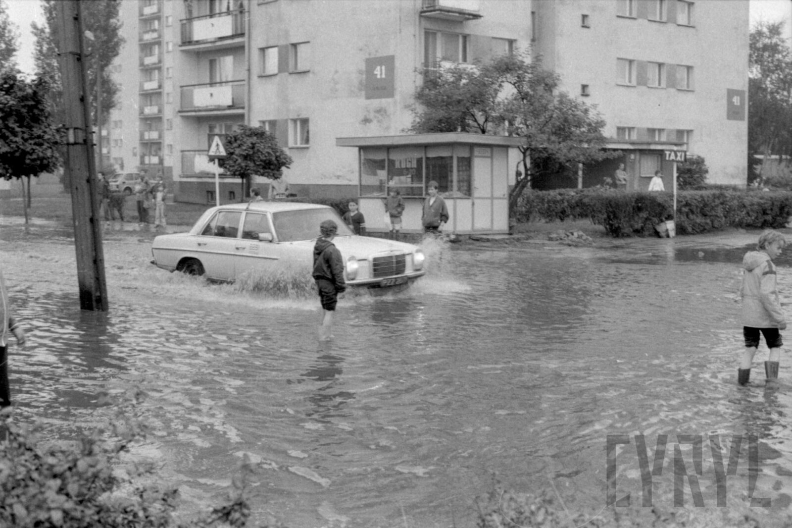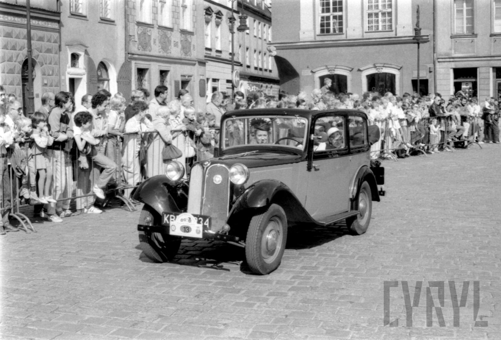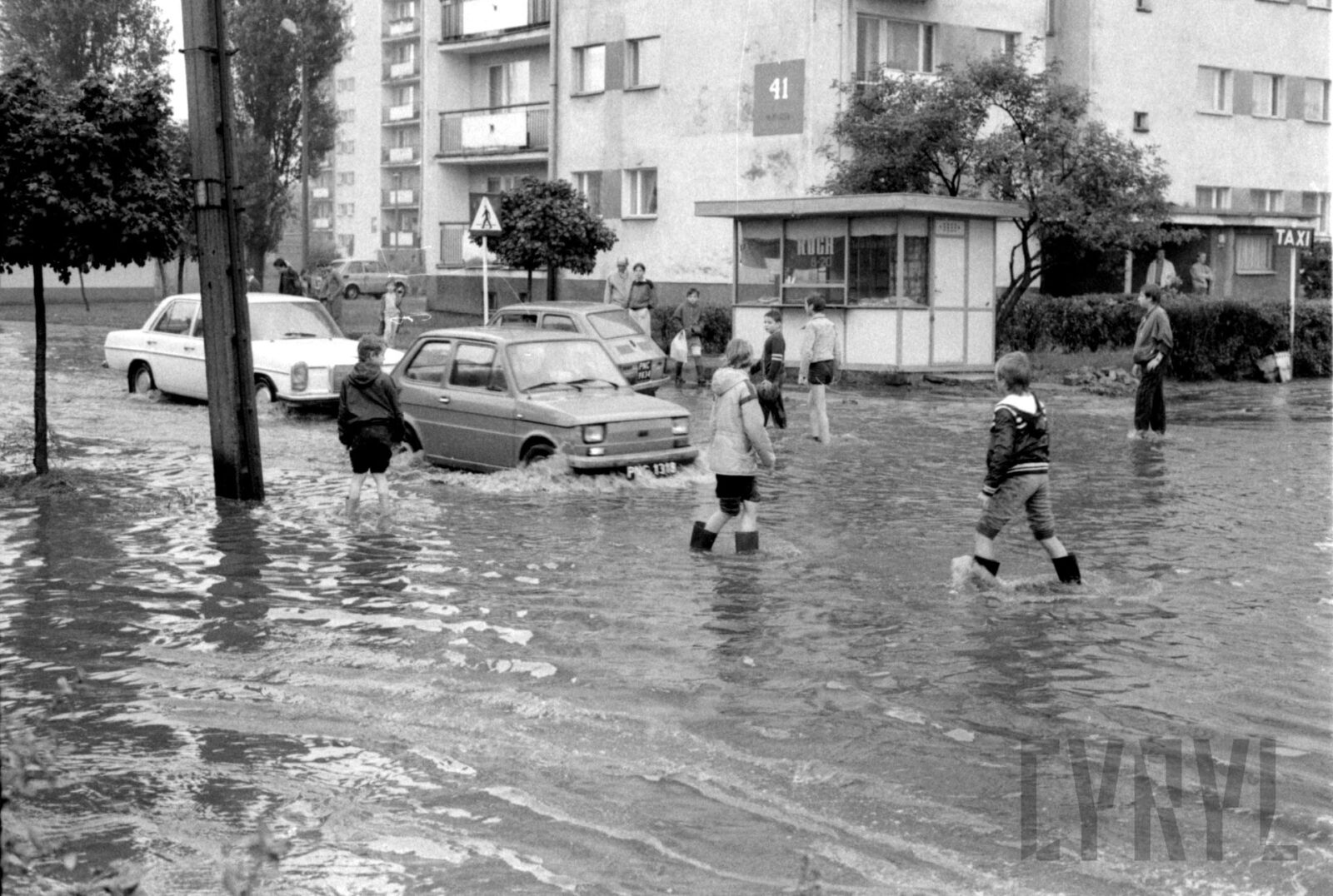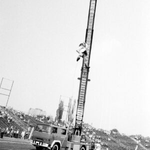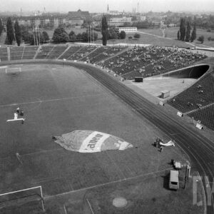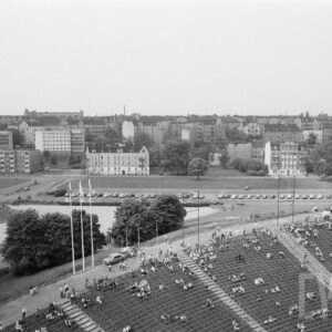 Dzieci obserwujące pokazy paralotniarzy w czasie wojewódzkiej inauguracji Tygodnia Kultury Fizycznej na Stadionie im. 22 Lipca (dzisiaj Stadion im. E. Szyca)1980–1989