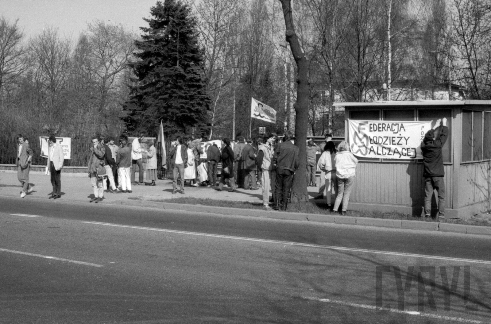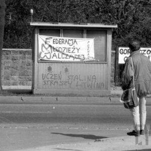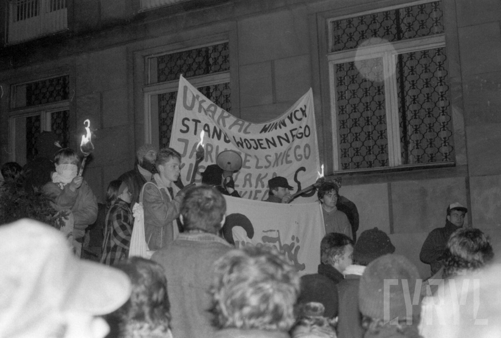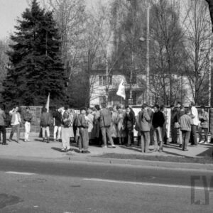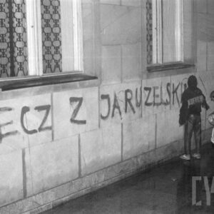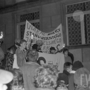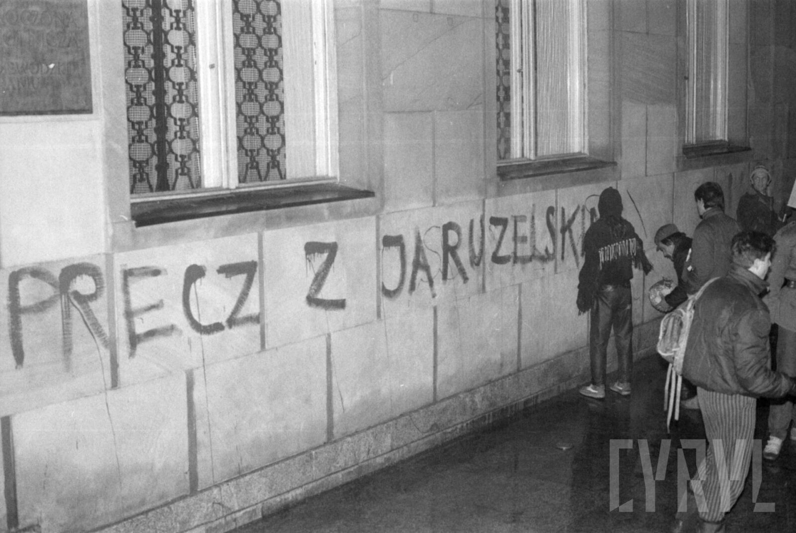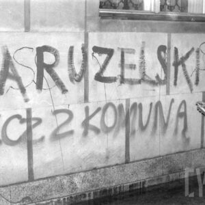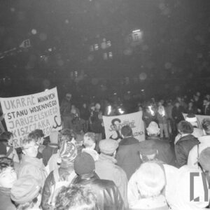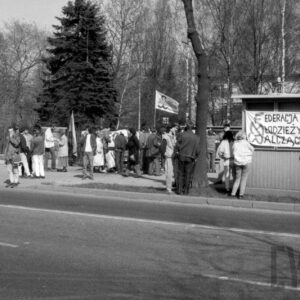 Protest Solidarności Walczącej przed gmachem KW PZPR (dzisiaj Collegium Martineum) wzywający do odsunięcia od władzy generała Wojciecha Jaruzelskiego1989–1990