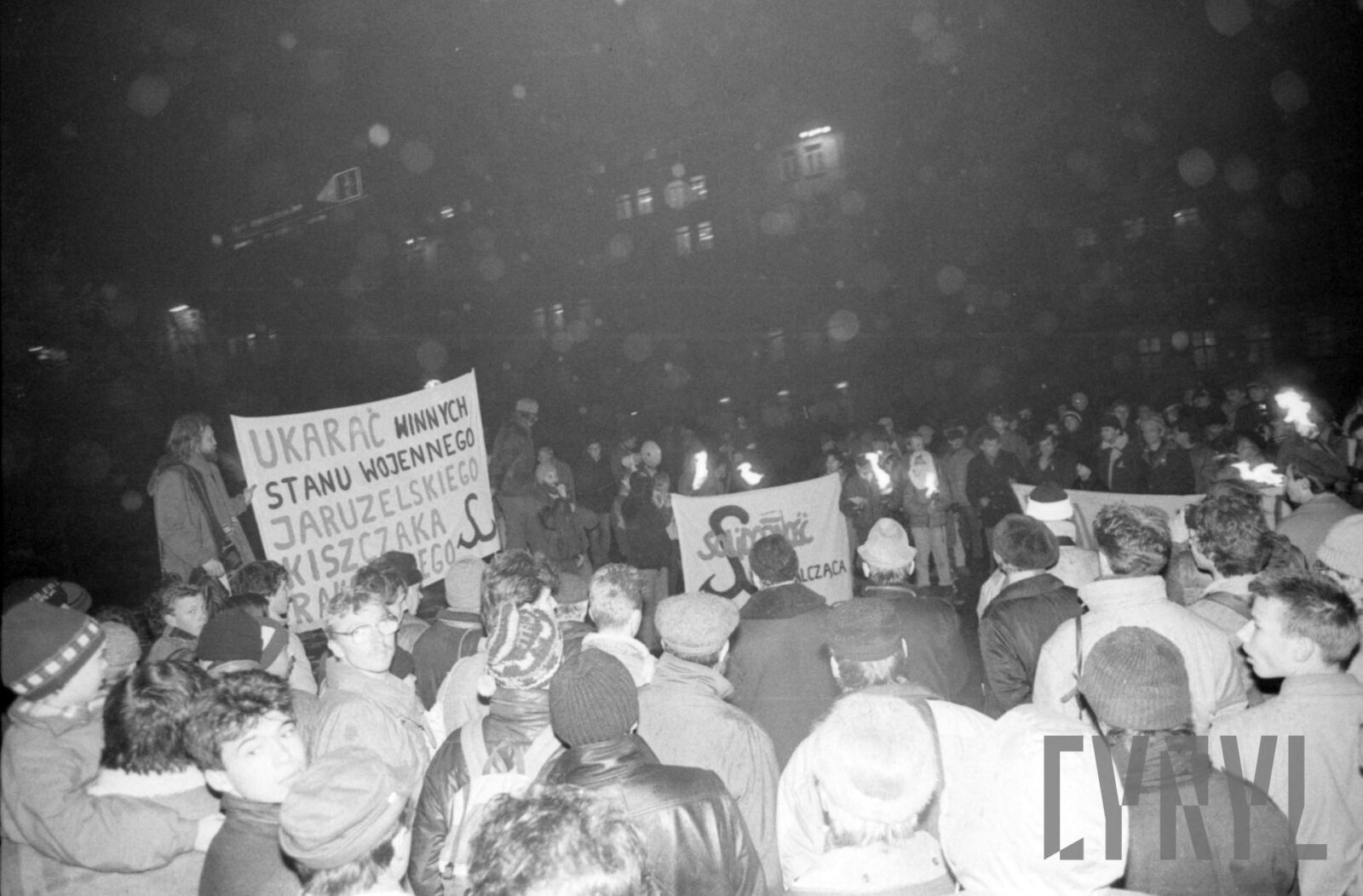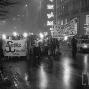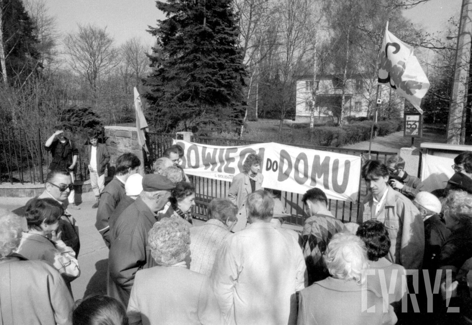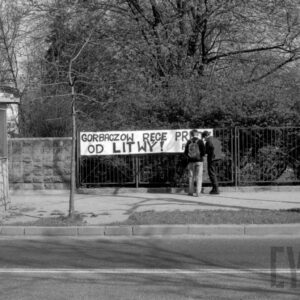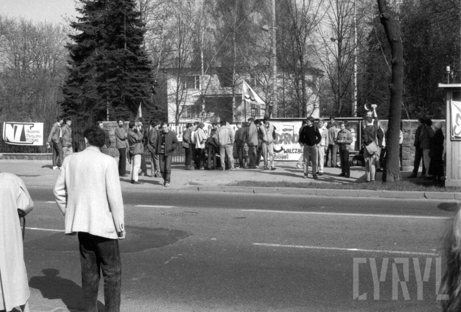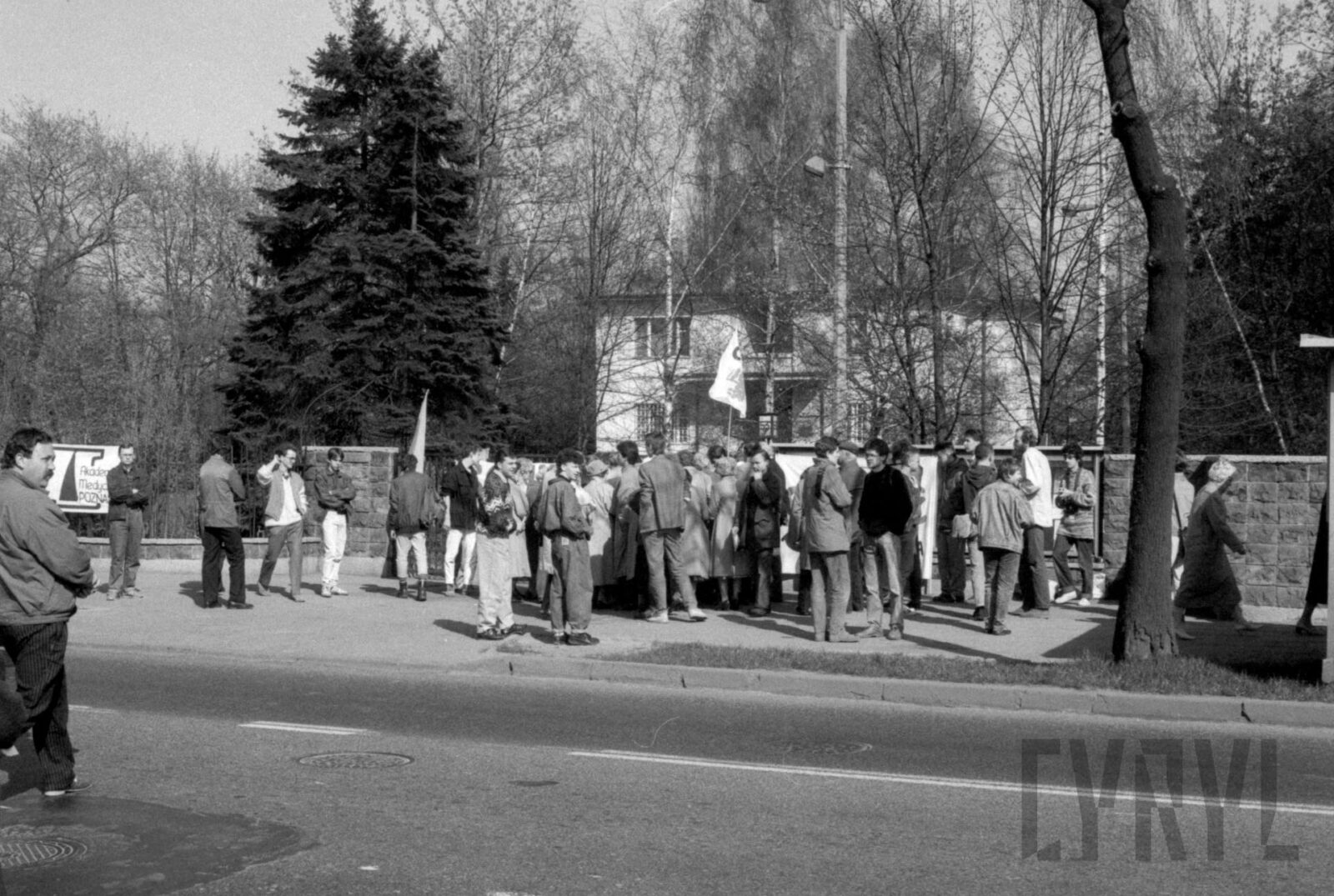 Protest Solidarności Walczącej przed gmachem KW PZPR (dzisiaj Collegium Martineum) wzywający do odsunięcia od władzy generała Wojciecha Jaruzelskiego1989–1990