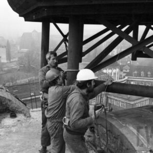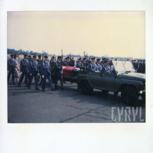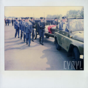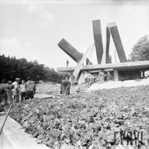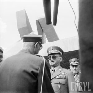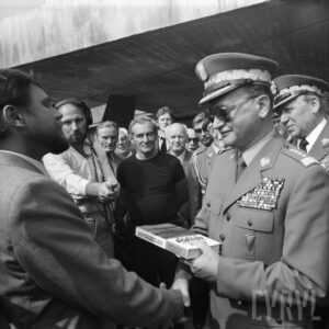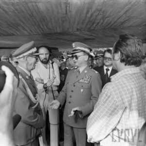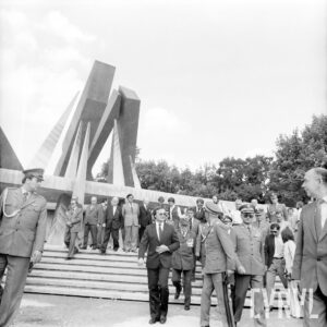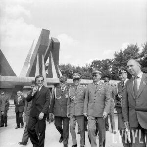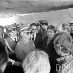 Wizyta generała Wojciecha Jaruzelskiego w przededniu oficjalnego odsłonięcia pomnika Armii Poznań na Wzgórzu św. Wojciecha, generałowi towarzyszy m.in. wojewoda poznański Marian Król (w czarnym garniturze)29.08.1982