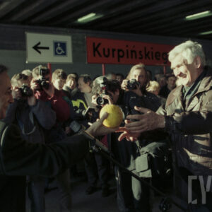 Prezydent Poznania Wojciech Szczęsny Kaczmarek (z lewej) w tramwaju linii nr 14, którego przejazd otworzył oficjalnie trasę Poznańskiego Szybkiego Tramwaju (PST, Pestki)30.01.1997