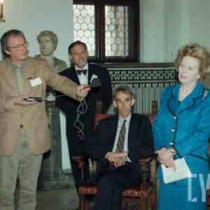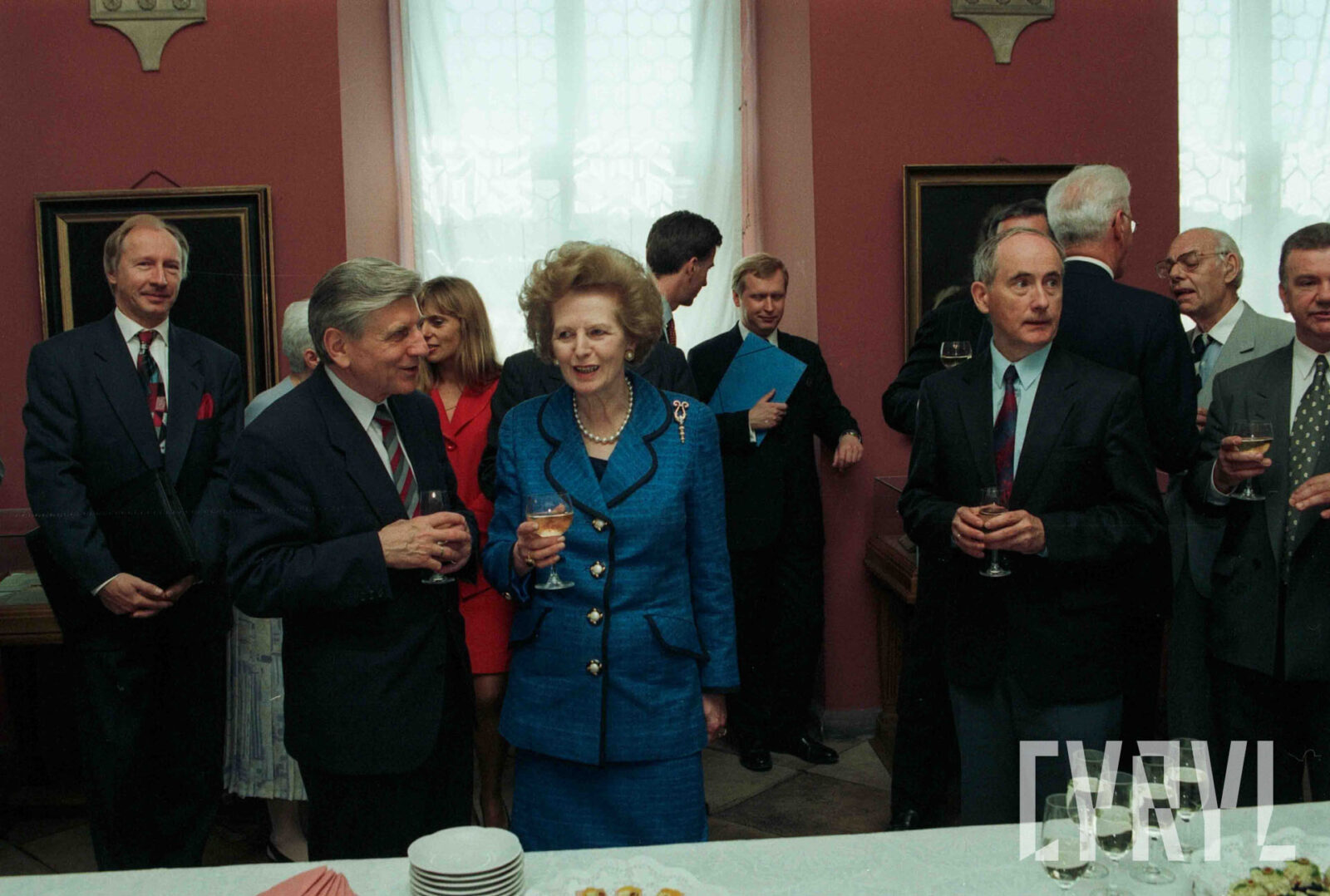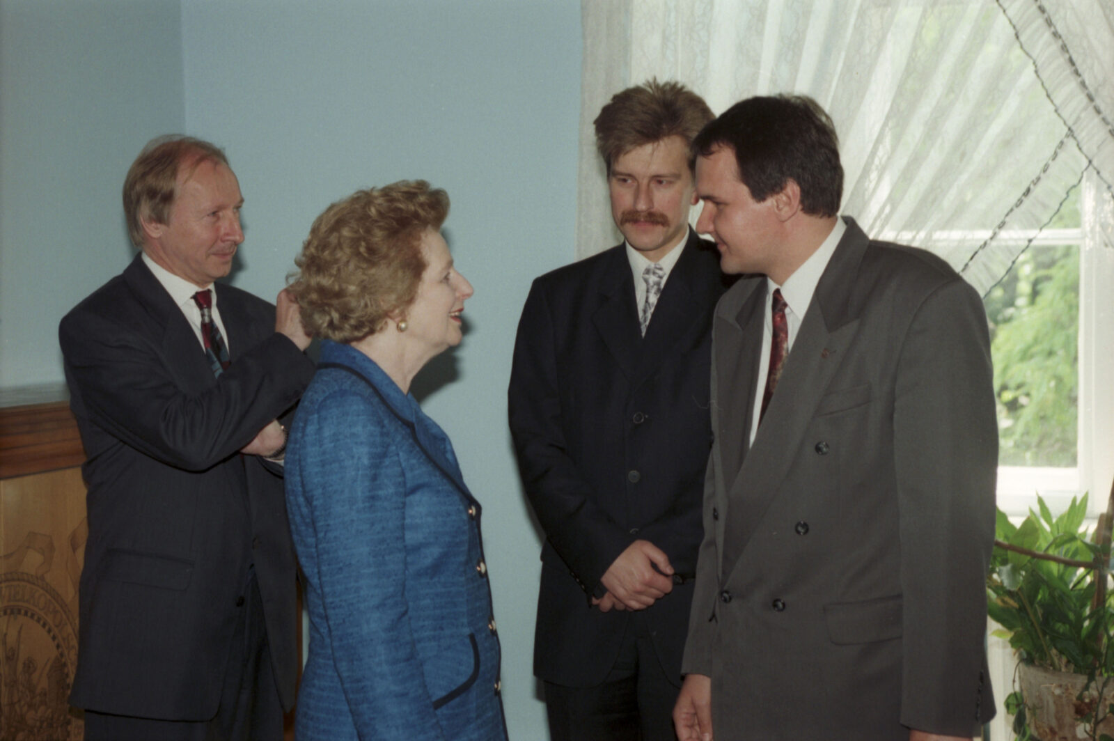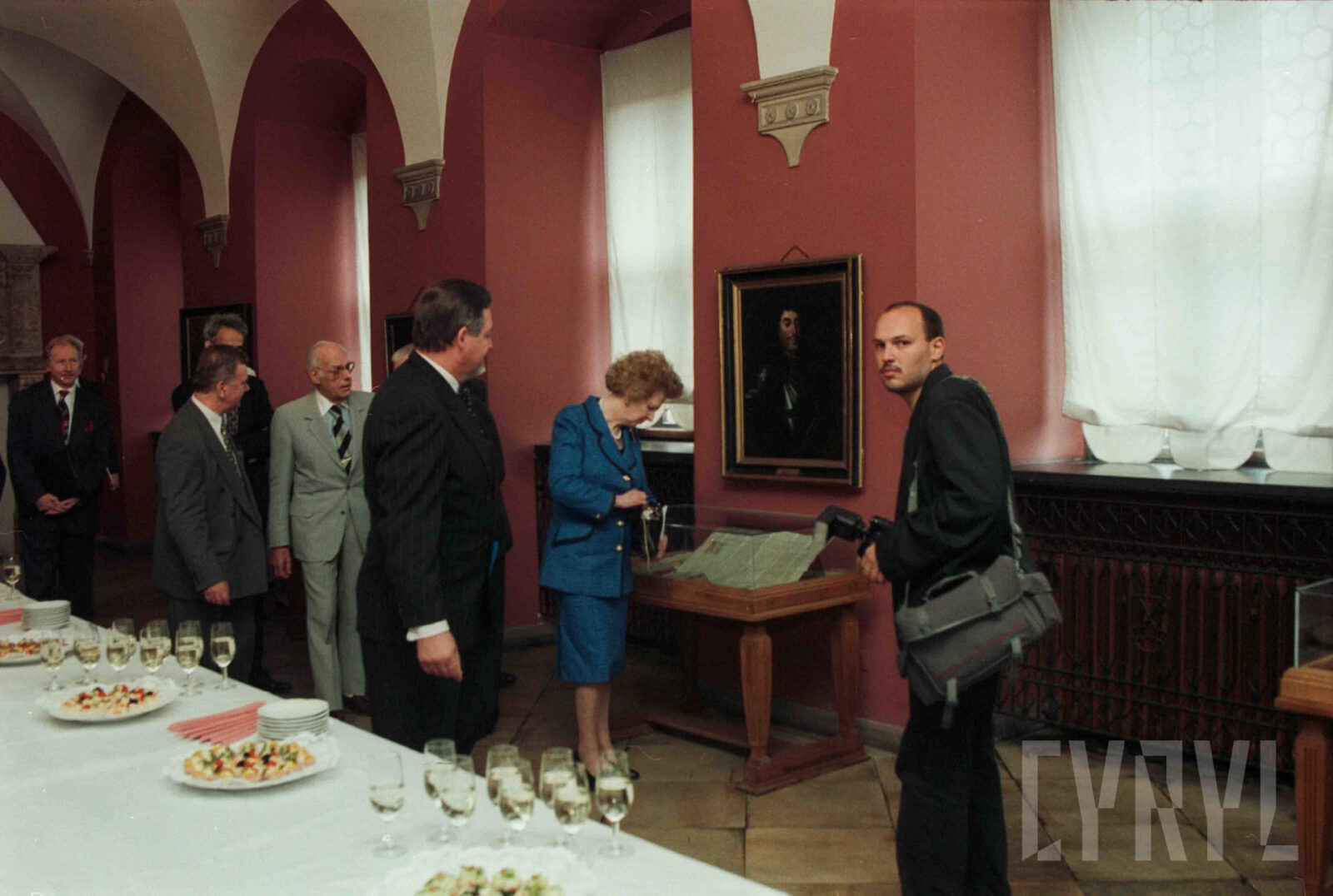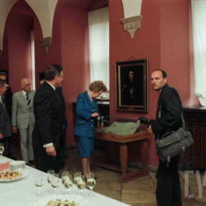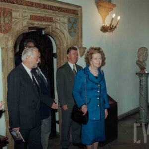 Wizyta Margaret Thatcher, byłej premier Wielkiej Brytanii, w Sali Królewskiej ratusza, drugi od lewej prof. Bohdan Gruchman, rektor Akademii Ekonomicznej w Poznaniu (dzisiaj Uniwersytet Ekonomiczny)03.07.1996