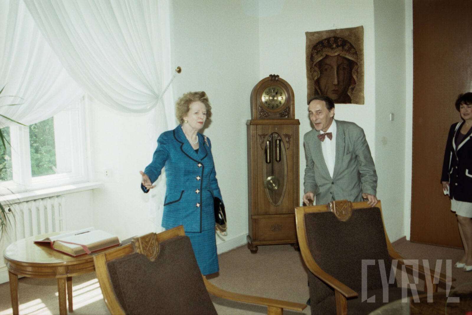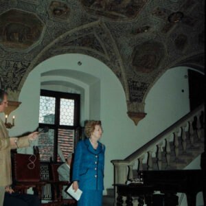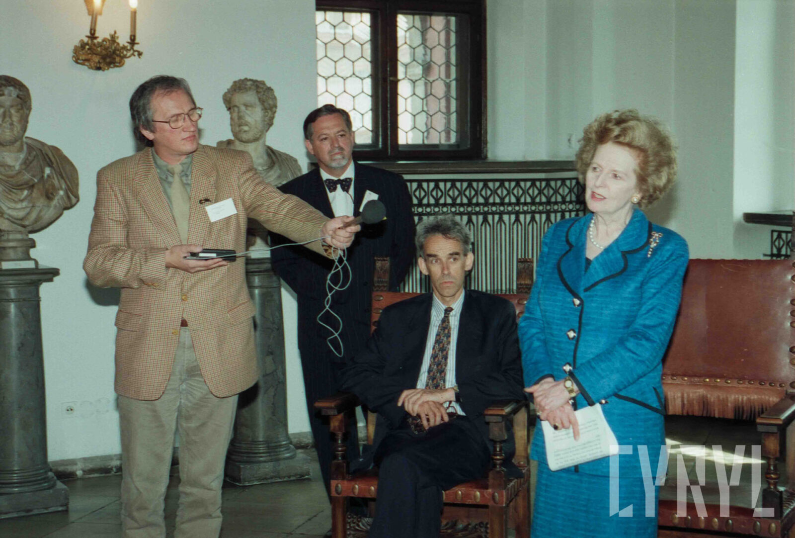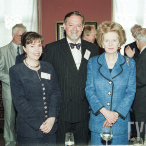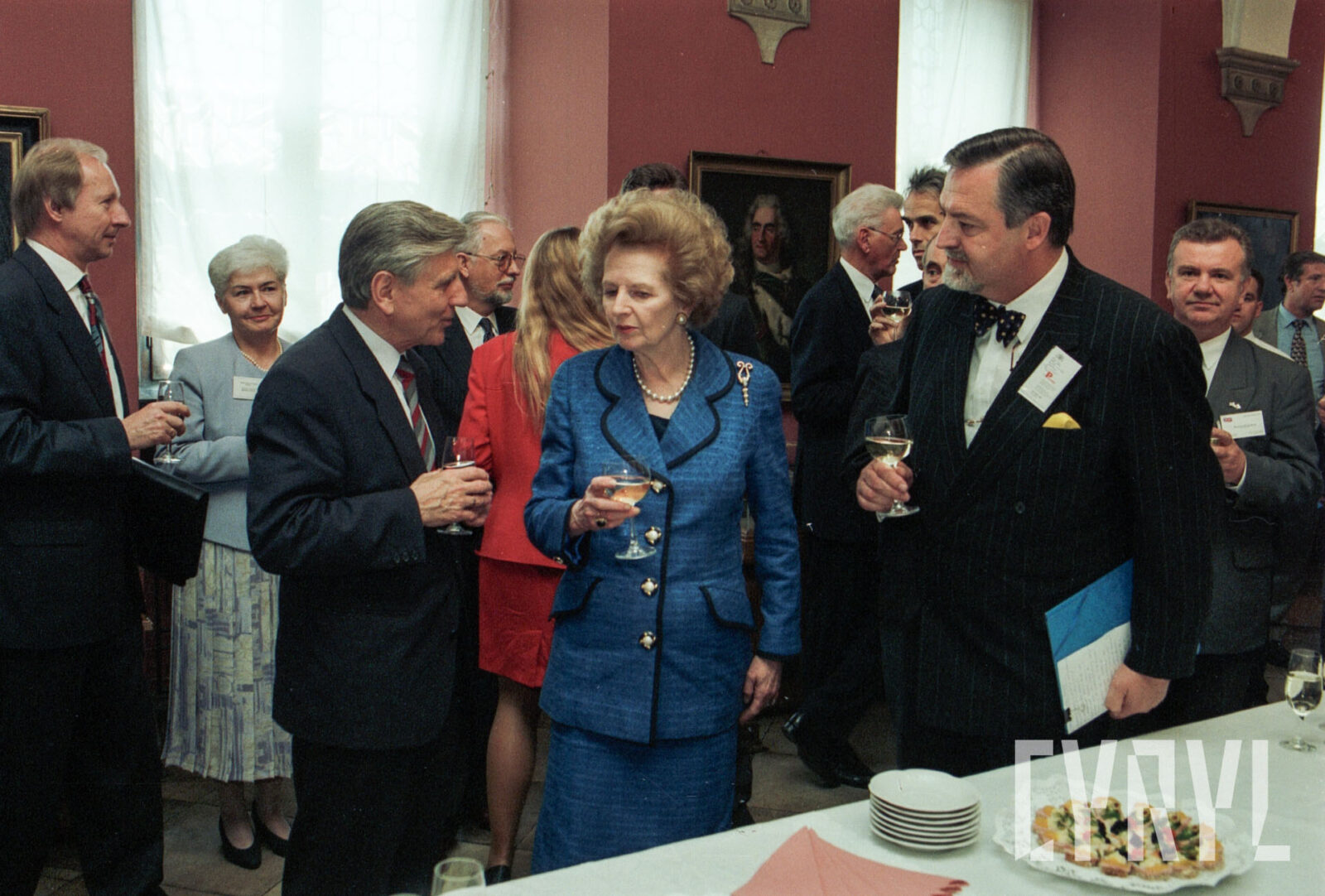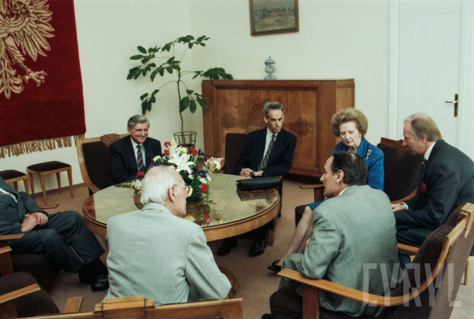 Wizyta Margaret Thatcher, byłej premier Wielkiej Brytanii, w Sali Królewskiej ratusza, drugi od lewej prof. Bohdan Gruchman, rektor Akademii Ekonomicznej w Poznaniu (dzisiaj Uniwersytet Ekonomiczny)03.07.1996