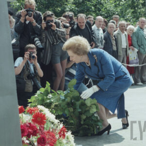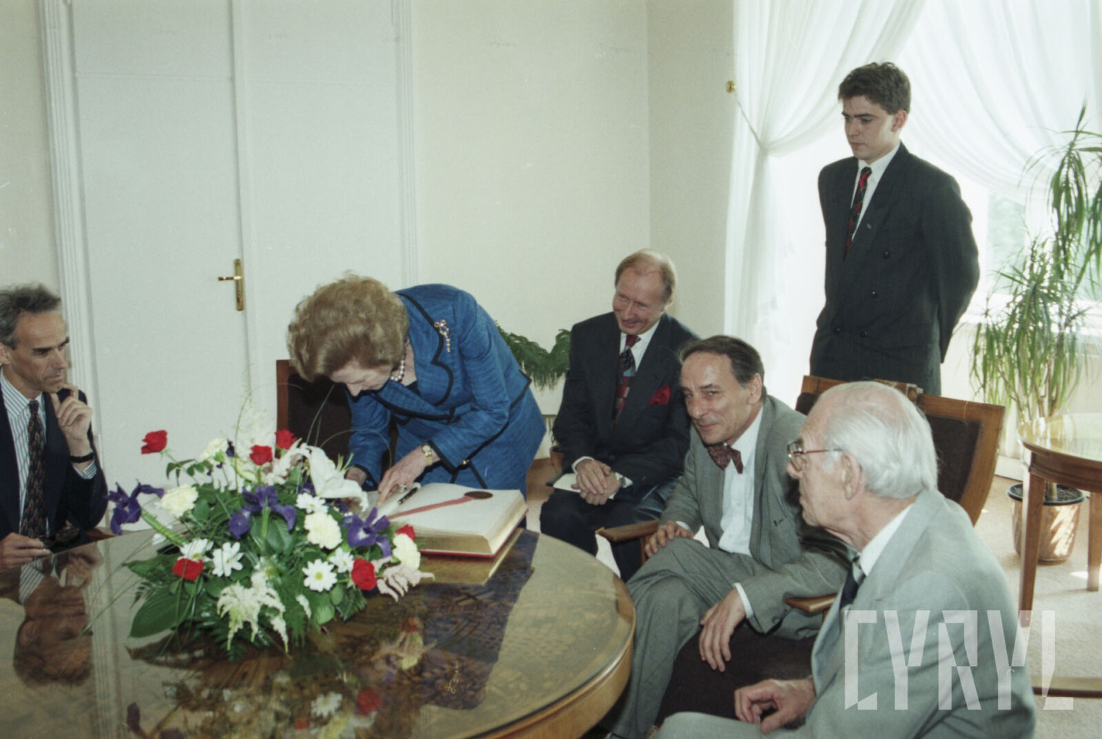 Margaret Thatcher, była premier Wielkiej Brytanii, składająca wpis do księgi pamiątkowej w czasie wizyty w Urzędzie Miasta Poznania, obok siedzą m.in.: Denis Thatcher (pierwszy od prawej) oraz prezydent Wojciech Szczęsny Kaczmarek (drugi od prawej)03.07.1996