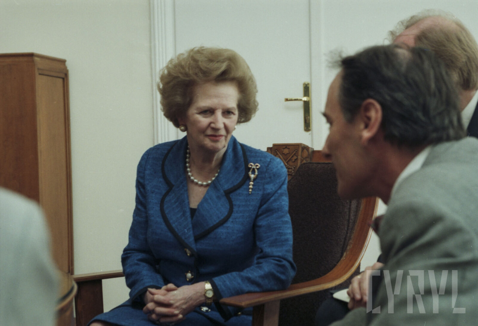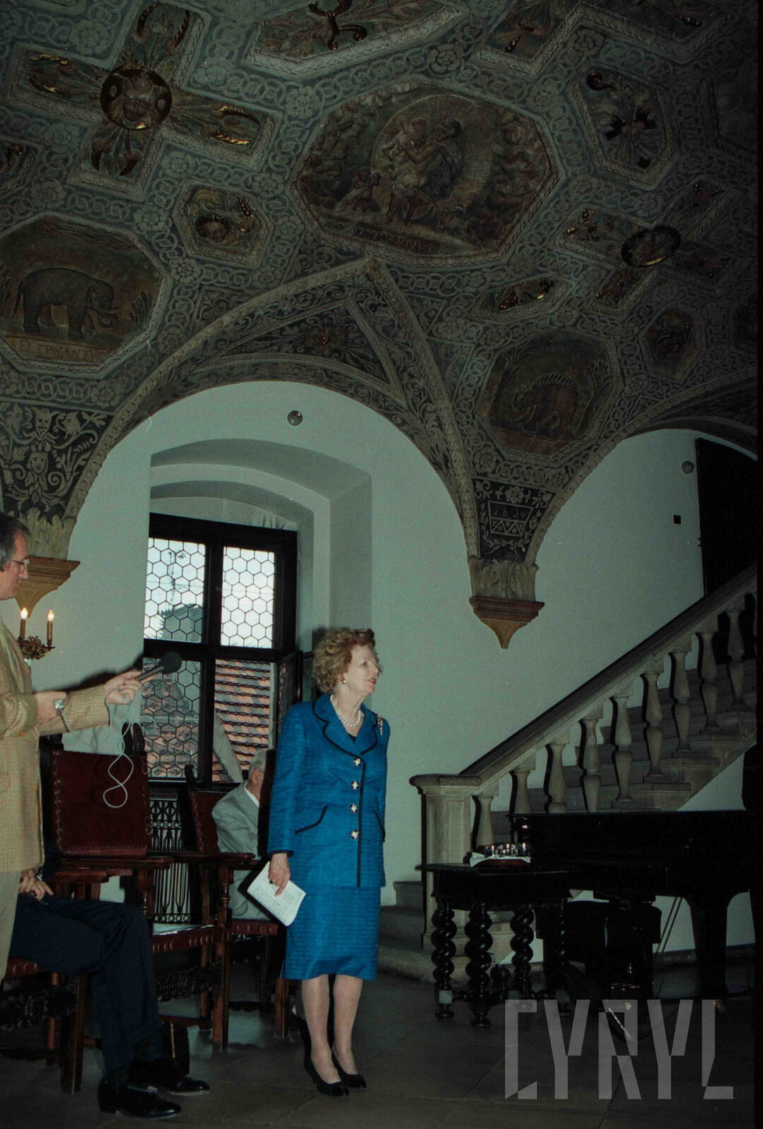Wizyta Margaret Thatcher, byłej premier Wielkiej Brytanii, w Sali Renesansowej ratusza, gdzie dokonała uroczystego otwarcia poznańskiej filii Brytyjskiej Izby Handlowej w Polsce, na krześle siedzi ambasador Wielkiej Brytanii w Polsce Christopher Hum03.07.1996