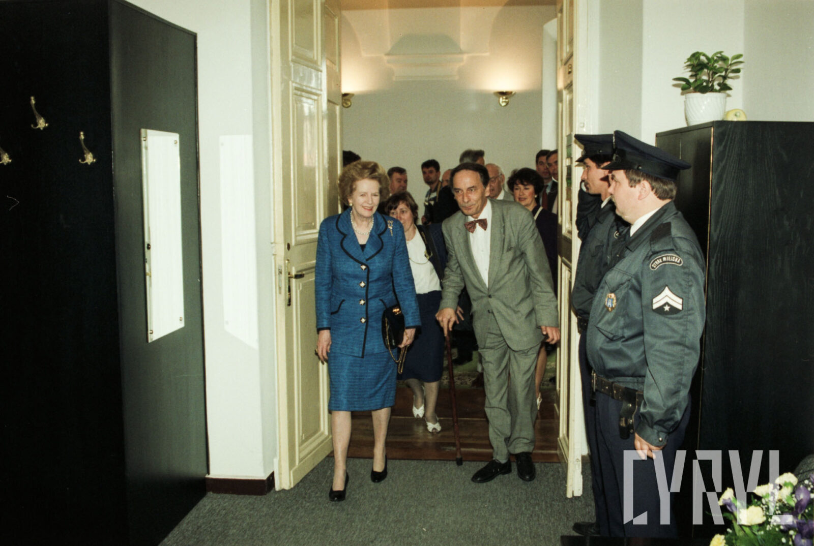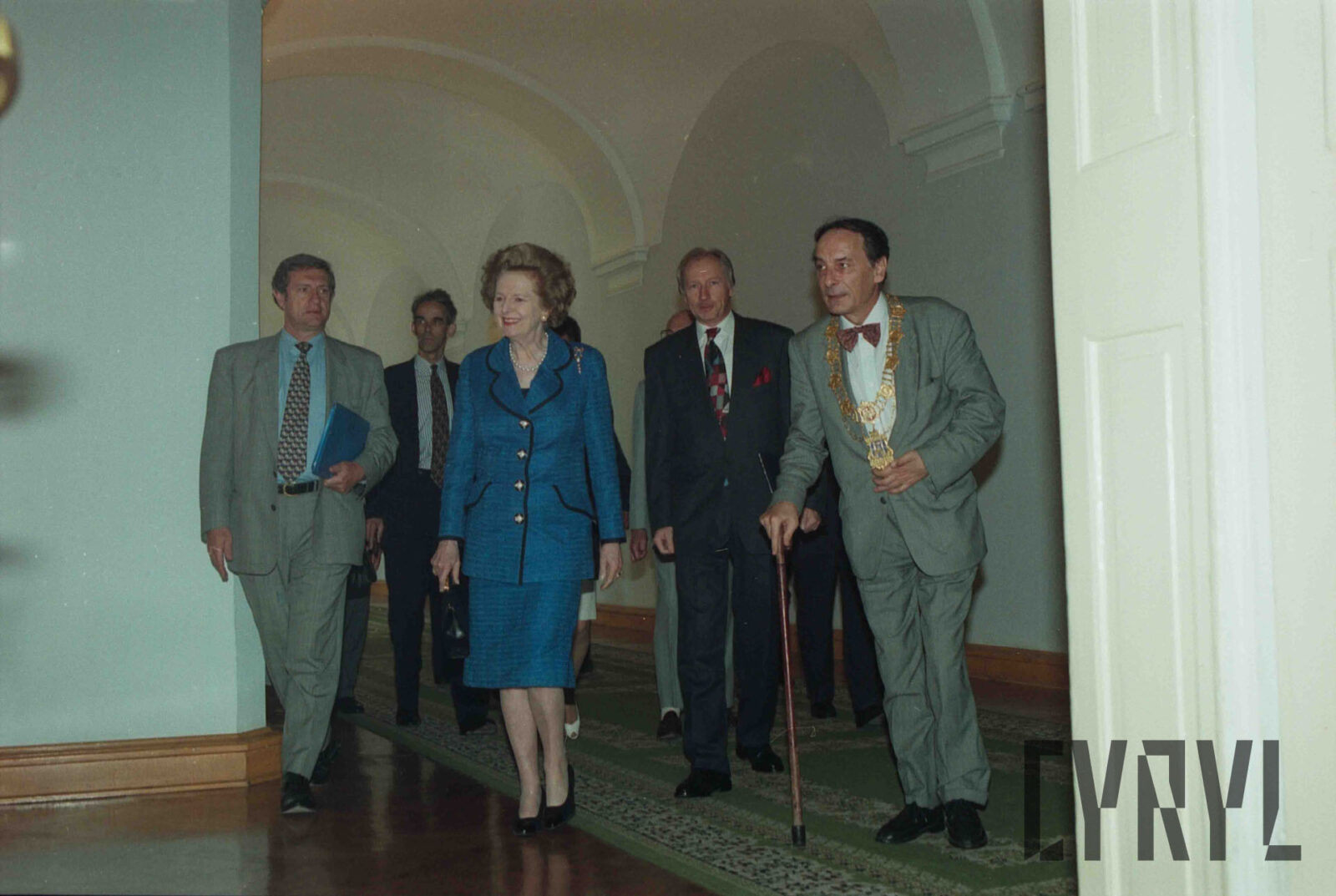 Wizyta Margaret Thatcher, byłej premier Wielkiej Brytanii, w Sali Białej Urzędu Miasta Poznania, pierwszy od prawej idzie prezydent Wojciech Szczęsny Kaczmarek03.07.1996
