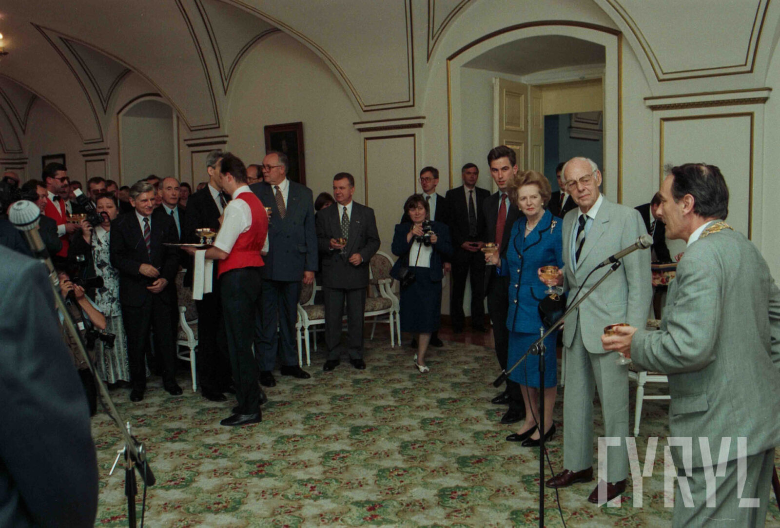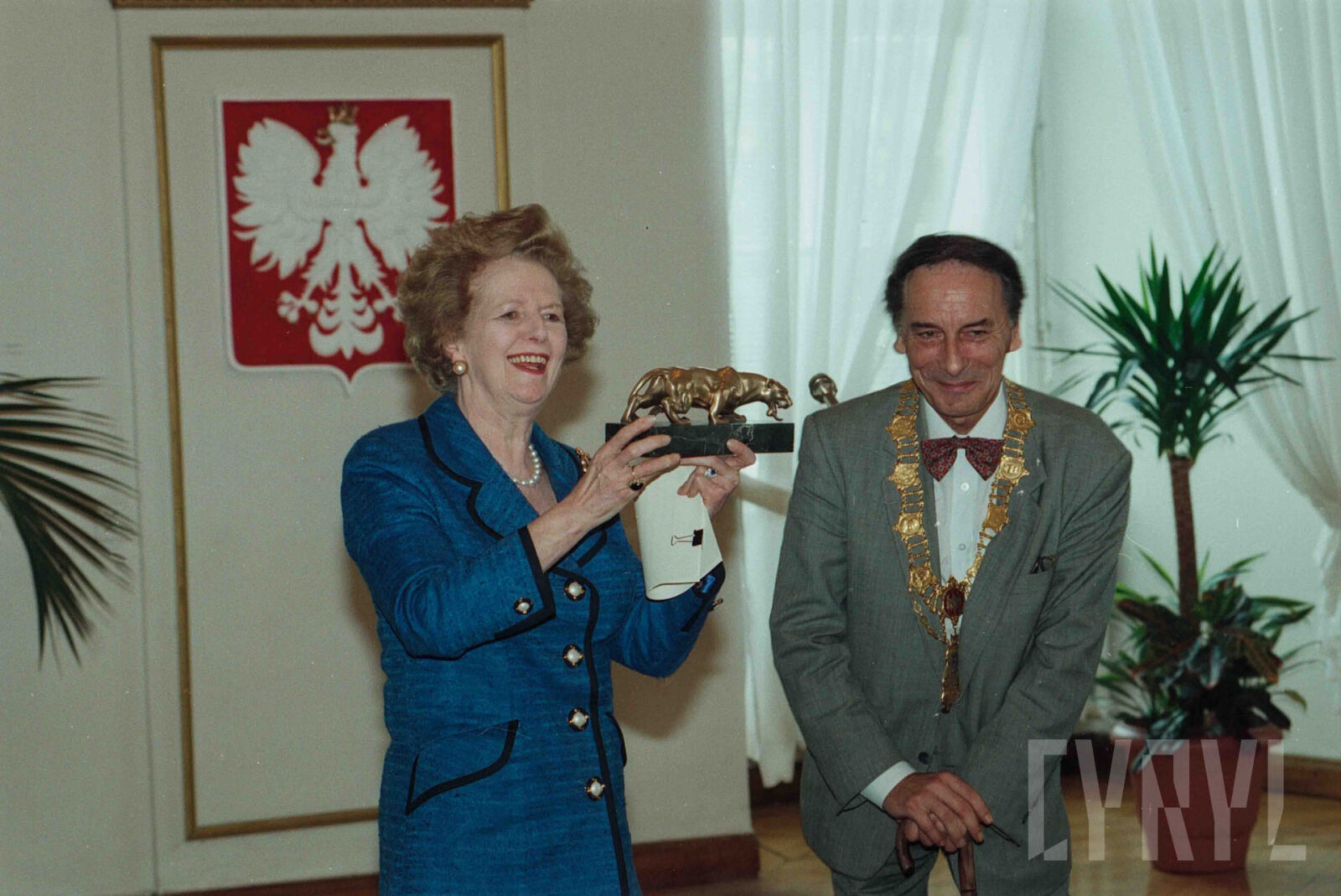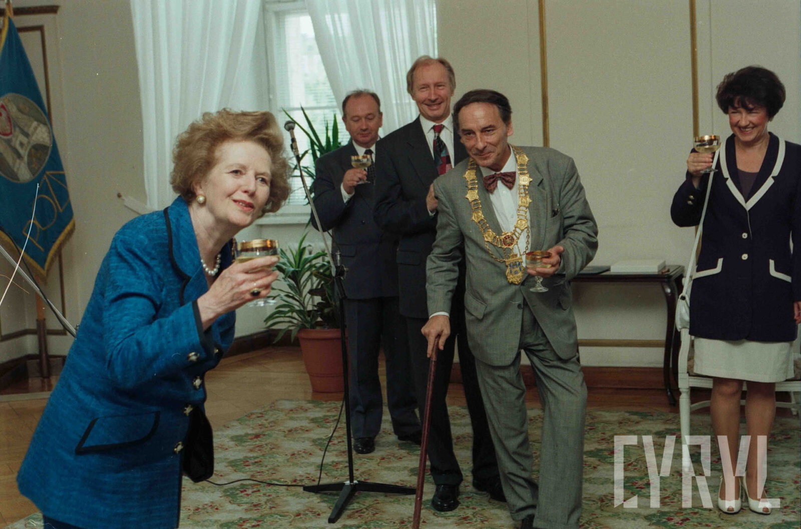 Uroczystość przyznania Margaret Thatcher, byłej premier Wielkiej Brytanii, tytułu Honorowego Obywatela Miasta Poznania w Sali Białej Urzędu Miasta Poznania, pierwszy od prawej prezydent Wojciech Szczęsny Kaczmarek03.07.1996