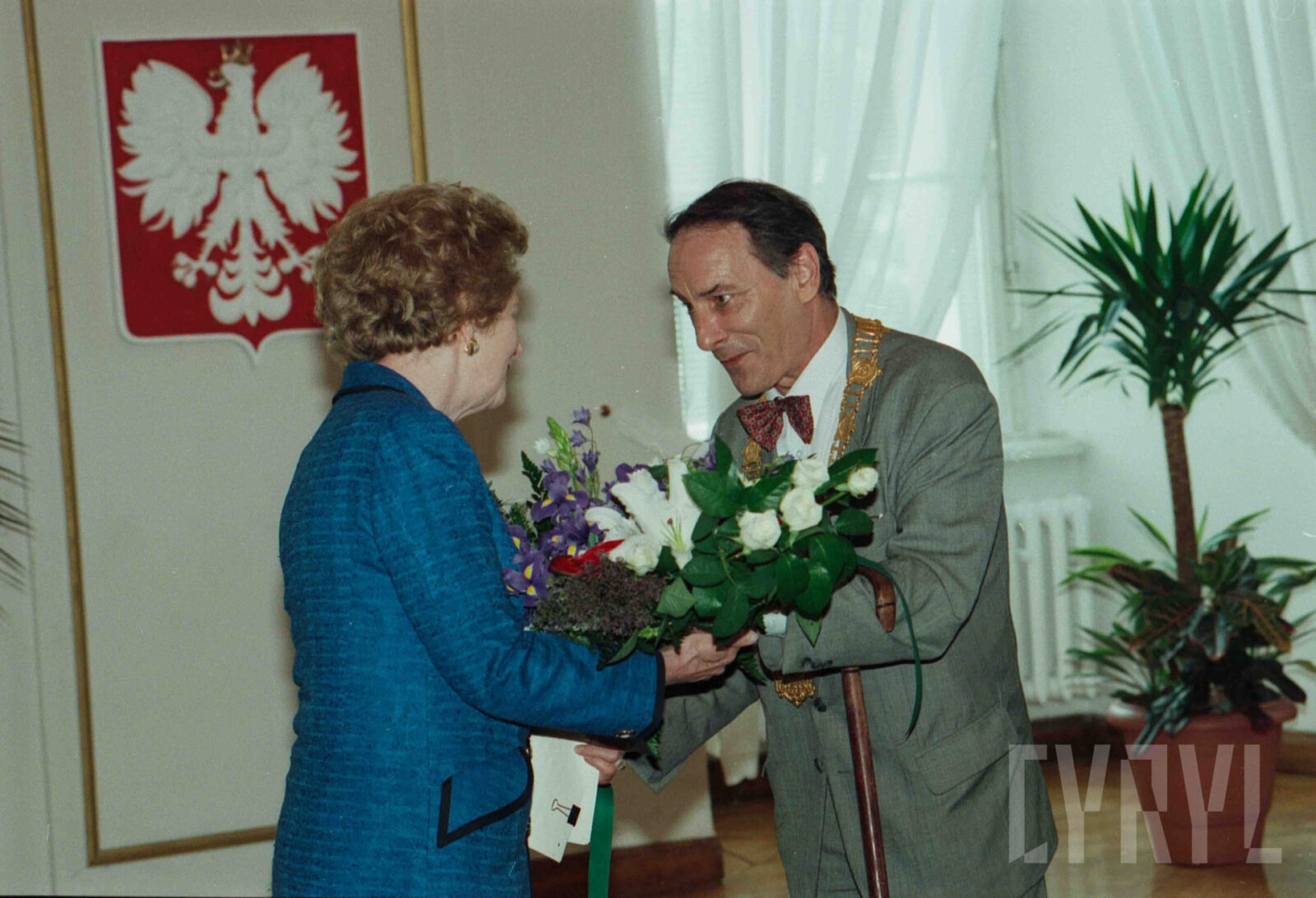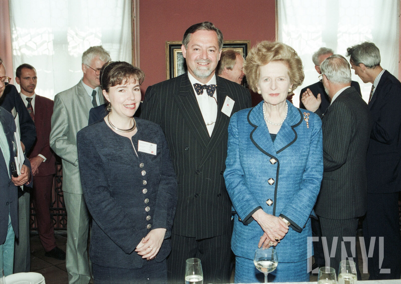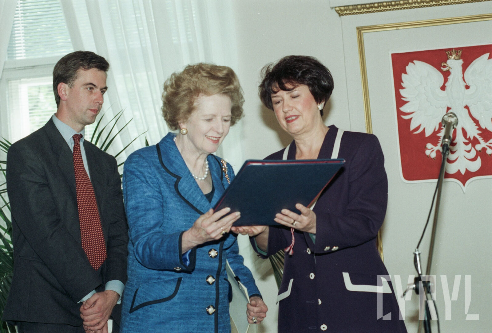 Uroczystość przyznania Margaret Thatcher, byłej premier Wielkiej Brytanii, tytułu Honorowego Obywatela Miasta Poznania w Sali Białej Urzędu Miasta Poznania, pierwszy od prawej prezydent Wojciech Szczęsny Kaczmarek03.07.1996