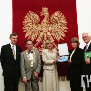 Wręczenie pamiątkowego dyplomu upamiętniającego przyznanie Margaret Thatcher, byłej premier Wielkiej Brytanii, tytułu Honorowego Obywatela Miasta Poznania, pierwsza z prawej przewodnicząca Rady Miasta Poznania Jadwiga Rotnicka03.07.1996