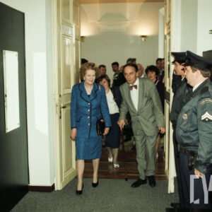 Powitanie Margaret Thatcher, byłej premier Wielkiej Brytanii, przez prezydenta Wojciecha Szczęsnego Kaczmarka (pierwszy od prawej) i profesora Bohdana Gruchmana (w środku), rektora Akademii Ekonomicznej w Poznaniu (dzisiaj Uniwersytet Ekonomiczny)03.07.1996