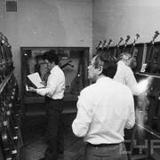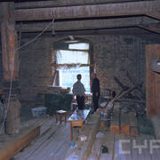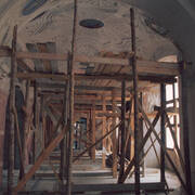 Proboszcz ks. Wojciech Wolniewicz i Jerzy Borwiński na poddaszu kolegiaty farnej, widoczne obramienie (mur) konstrukcji sklepienia pseudokopuły