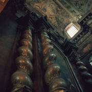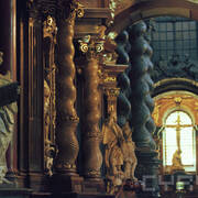 Spiralne kolumny oplecione wicią roślinną oraz polichromia zachodniego ramienia transeptu w kolegiacie farnej