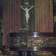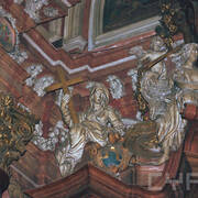Dekoracja ponad zwieńczeniem ołtarza głównego kolegiaty farnej, w centralnej części personifikacja Wiary (postać z krzyżem)