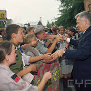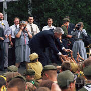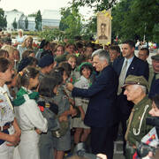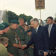 Premier Jerzy Buzek wita się z uczestnikami Jubileuszowego Zlotu Dziesięciolecia ZHR "Lednica 99" w parku Wilsona