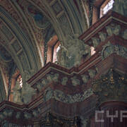 Dekoracja fryzu, gzymsu i fragment dekoracji sklepienia ponad głowicami kolumn na styku nawy głównej i transeptu kolegiaty farnej
