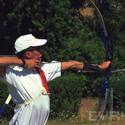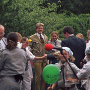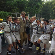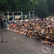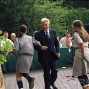 Premier Jerzy Buzek w czasie zabawy towarzyszącej grze samorządowej "Burmistrz 99" w parku Wilsona na Jubileuszowym Zlocie Dziesięciolecia ZHR "Lednica 99"