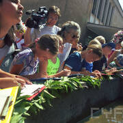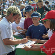 Galo Blanco, zwycięzca Polish Open 1999 w grze pojedynczej, rozdaje autografy młodym adeptom tenisa na kortch tenisowych KS Olimpia (dzisiaj Park Tenisowy Olimpia)