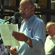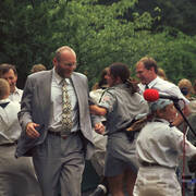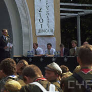 Prezydent miasta Poznania Ryszard Grobelny w czasie zabawy towarzyszącej grze samorządowej "Burmistrz 99" na Jubileuszowym Zlocie Dziesięciolecia ZHR "Lednica 99"