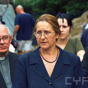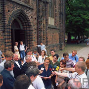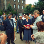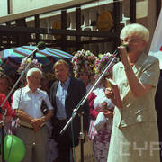 Prezes Towarzystwa Bambrów Poznańskich Maria Paradowska otwiera Święto Bamberskie na Starym Rynku, po lewej stronie stoją abp Juliusz Paetz oraz przedstawiciel nadburmistrza Bambergu Herbert Gerhard Krischker (w marynarce)