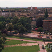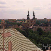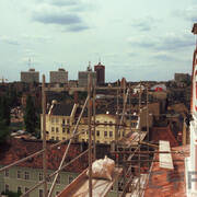 Widok z gzymsu południowej części kolegiaty farnej w kierunku południowo-zachodnim, w głębi kamienica na narożniku ulic Wrocławskiej i Podgórnej, dalej wieżowce przy ul. Piekary