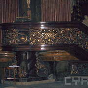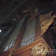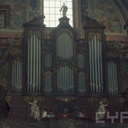 Widok na zniszczony miech organów Friedricha Ladegasta w kolegiacie farnej