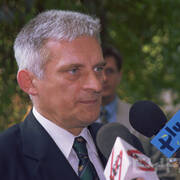 Premier Jerzy Buzek udziela wywiadu podczas spotkania z uczestniami Jubileuszowego Zlotu Dziesięciolecia ZHR "Lednica 99" w parku Wilsona