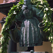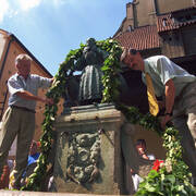 Dekorowanie Studzienki Bamberki kwietną girlandą w czasie Święta Bamberskiego na Starym Rynku