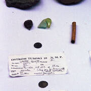 Dna naczyń wczesnośredniowiecznych, fragmenty szklanych butelek, kościana oprawka i moneta, odkryte w czasie badań archeologicznych prowadzonych pod kierunkiem prof. Hanny Kóčki-Krenz na Ostrowie Tumskim przy kościele NMP