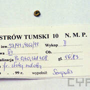 Fragment złotej ozdoby, zapewne oczko pierścionka i metryczka obiektu odkrytego w czasie badań archeologicznych prowadzonych pod kierunkiem prof. Hanny Kóčki-Krenz na Ostrowie Tumskim przy kościele Najświętszej Marii Panny