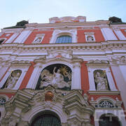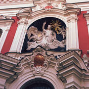 Środkowa część fasady kolegiaty farnej, w centralnej części grupa rzeźbiarska św. Ignacego Loyoli
